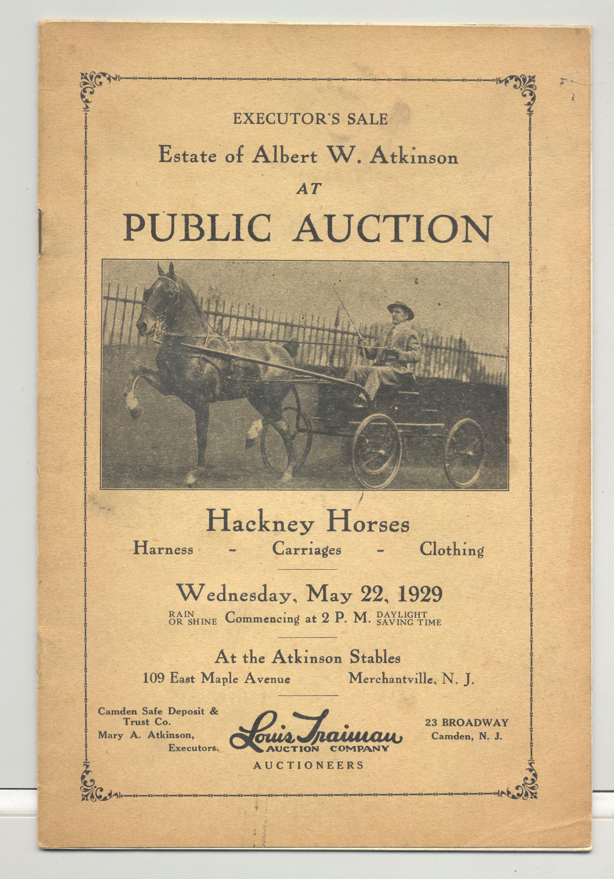 CAT, HORSE, 1929, NJ. ESTATE OF ALBERT ATKINSON, HACKNEY HORSES, HARNESS, CARRIAGES, CLOTHING. LOUIS TRAIMAN, AUCTIONEERS. 16 PP. PRICES WRITTEN IN. 6" X 9"Created By