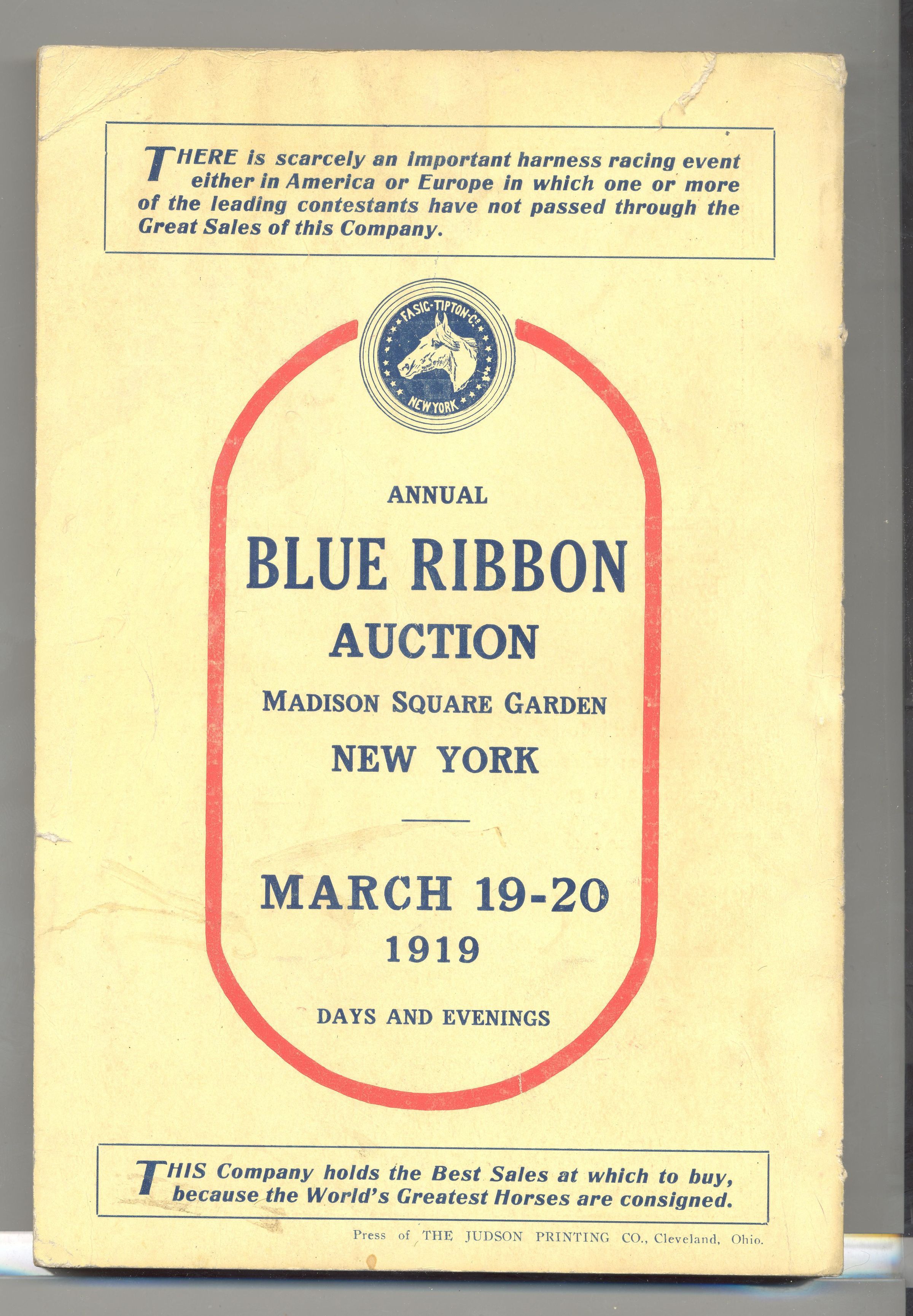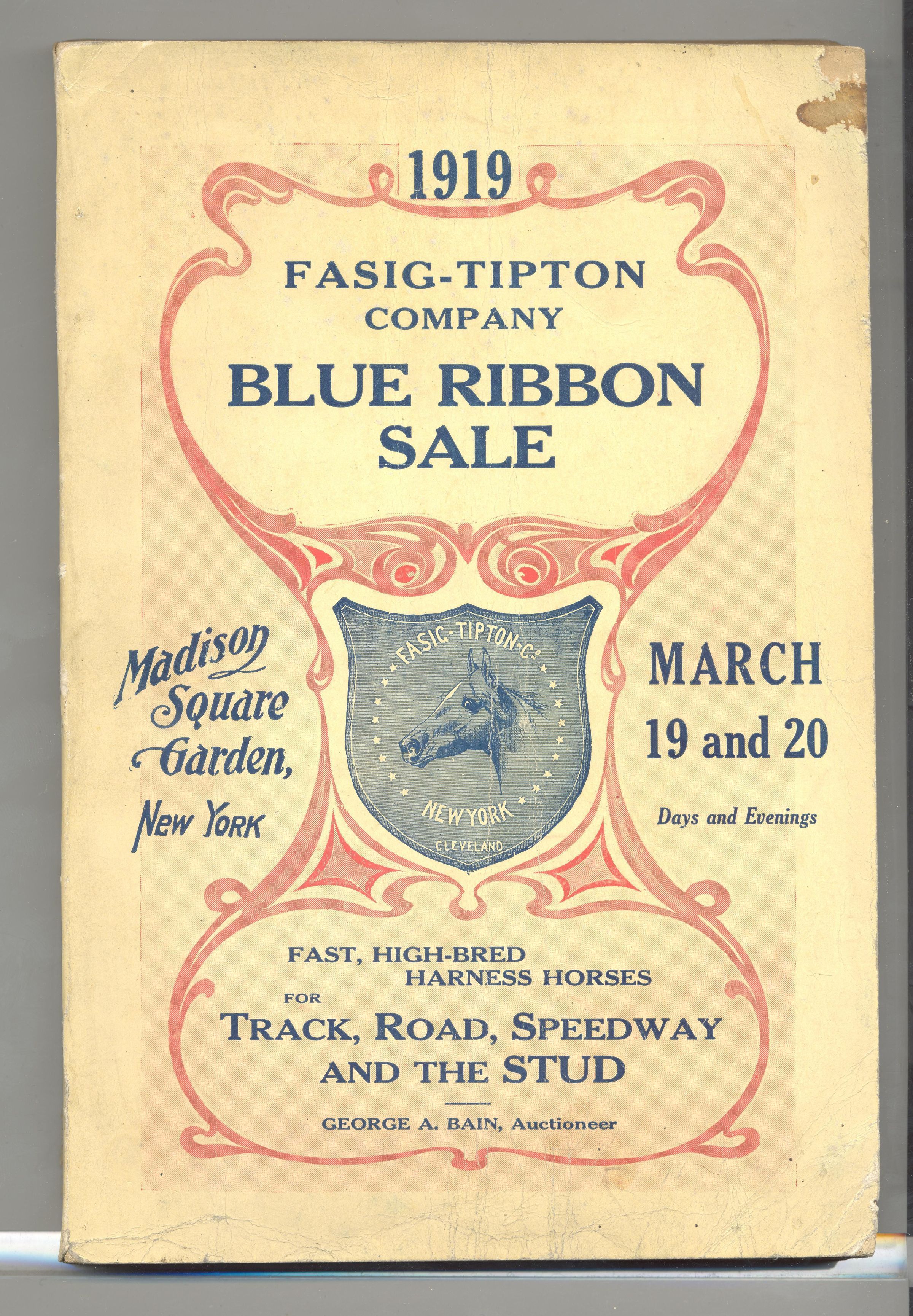 CAT, HORSE, 1919, NY. FASIG-TIPTON CO. BLUE RIBBON SALE. FAST HIGH-BRED HARNESS HORSES FOR TRACK, ROAD, SPEEDWAY AND THE STUD. GEORGE BAIN, AUCTIONEER. 6" X 8 3/4" X 1/2"Created By