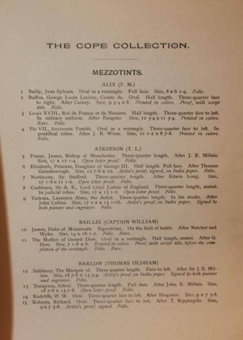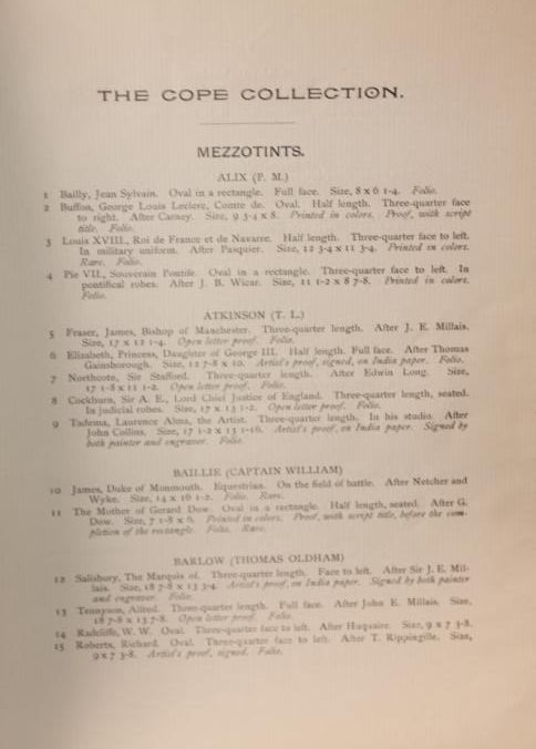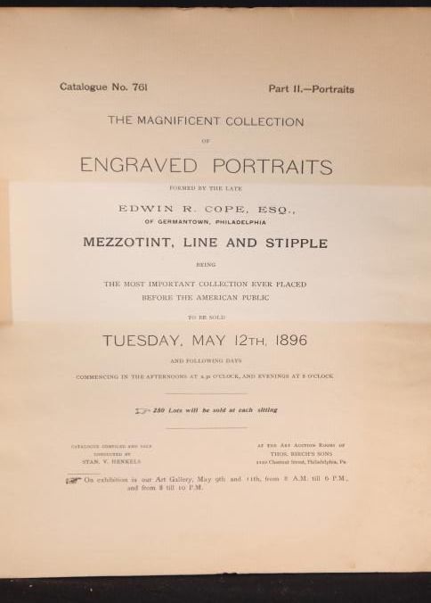 CAT, ART, 1896, PA. CATALOGUE NO. 761, PART II - PORTRAITS. THE GREAT COPE COLLECTION OF ENGRAVINGS, MEZZOTINT, LINE AND STIPPLE. STAN HENKELS, AUCT. 68 PP. ILLUS W/BLACK AND WHITE PLATES. 9 3/4" X 12"Created By