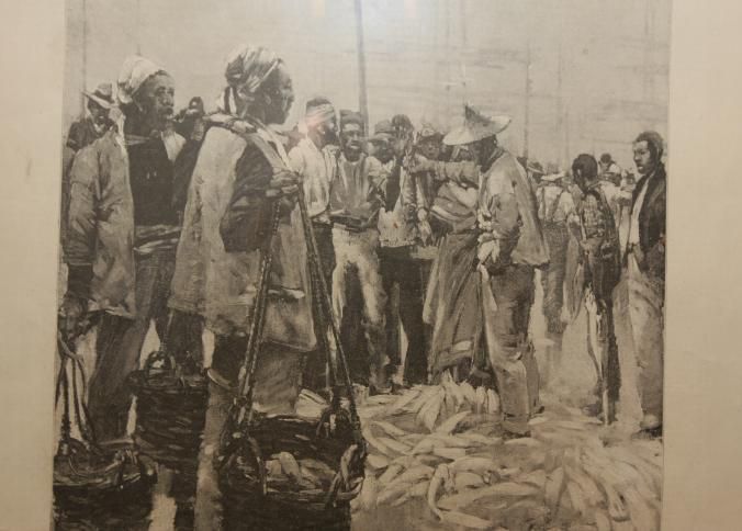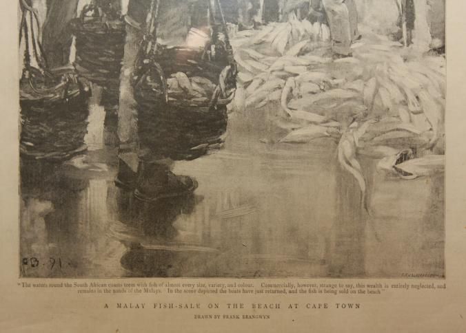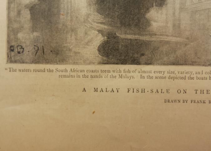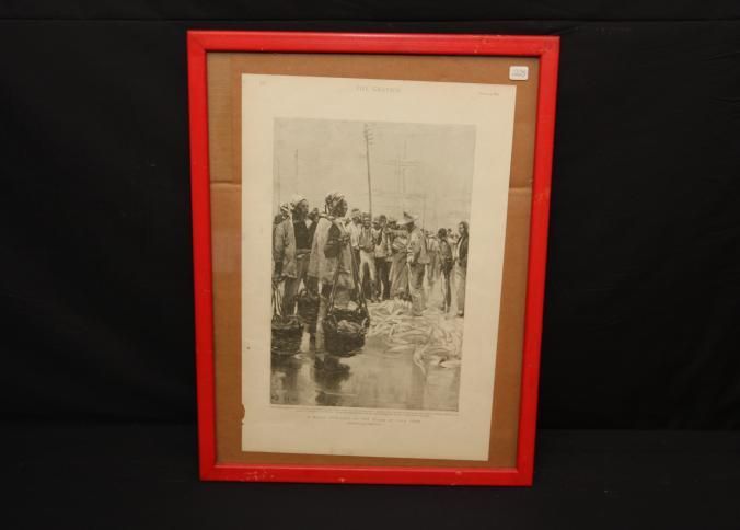 FR. 1894 WOODCUT ENGRAVING OF A FISH AUCTION IN CAPE TOWN S. AFRICA. A FULL PAGE FROM THE "GRAPHIC" MAGAZINE. 11X15 1/2".Created By