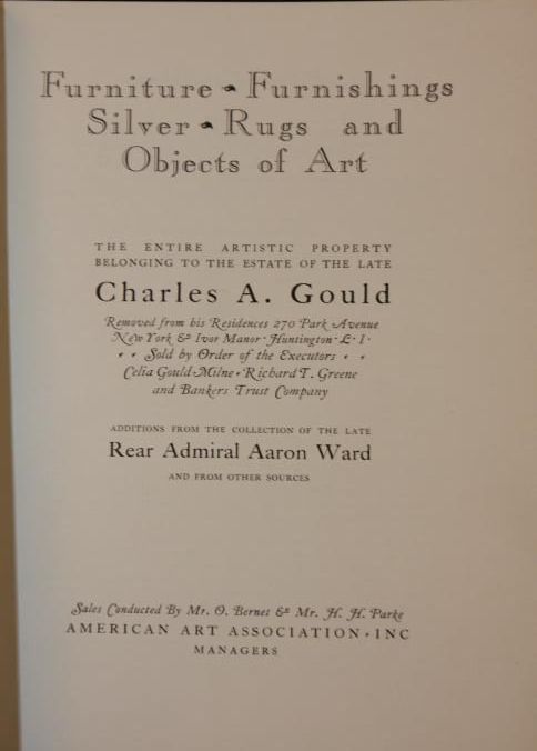 CAT, ART, 1926, NY. FRENCH FURNITURE, SILVER, ORIENTAL RUGS AND OBJECTS OF ART, CHARLES GOULD ESTATE. AMERICAN ART ASSOC. 211 PP. 7" X 10"Created By