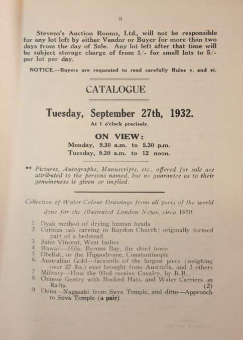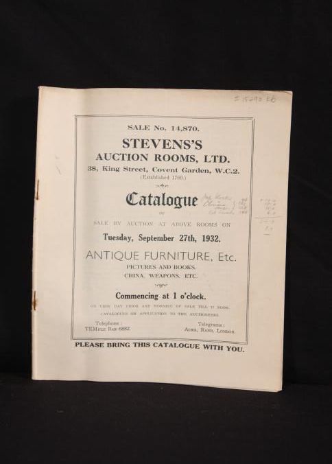 CAT, FURNITURE, 1932, ENGLAND. SALE NO. 14,870, STEVENS'S AUCTION ROOMS, LTD. SOME PRICES, 13 PP. 6 1/2" X 8 1/4"Created By