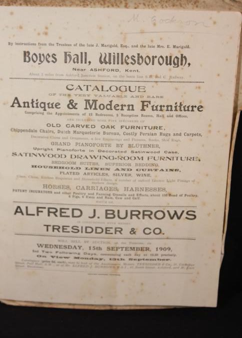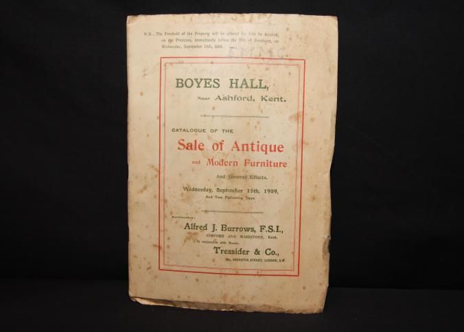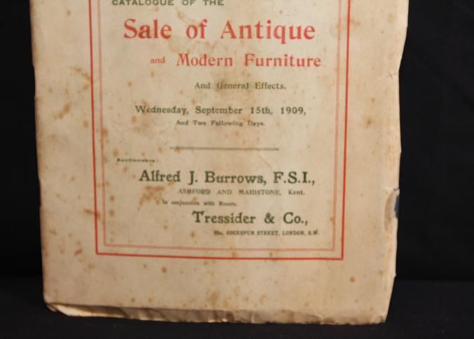 CAT, FURNITURE, 1909, LONDON. FREEHOLD PROPERTY, ANTIQUE AND MODERN FURNITURE. ALFRED BURROWS, TRESSIDER & CO, AUCTIONEERS. SOME PRICES MARKED, 44 PP. 7 1/2" X 10 1/2"Created By
