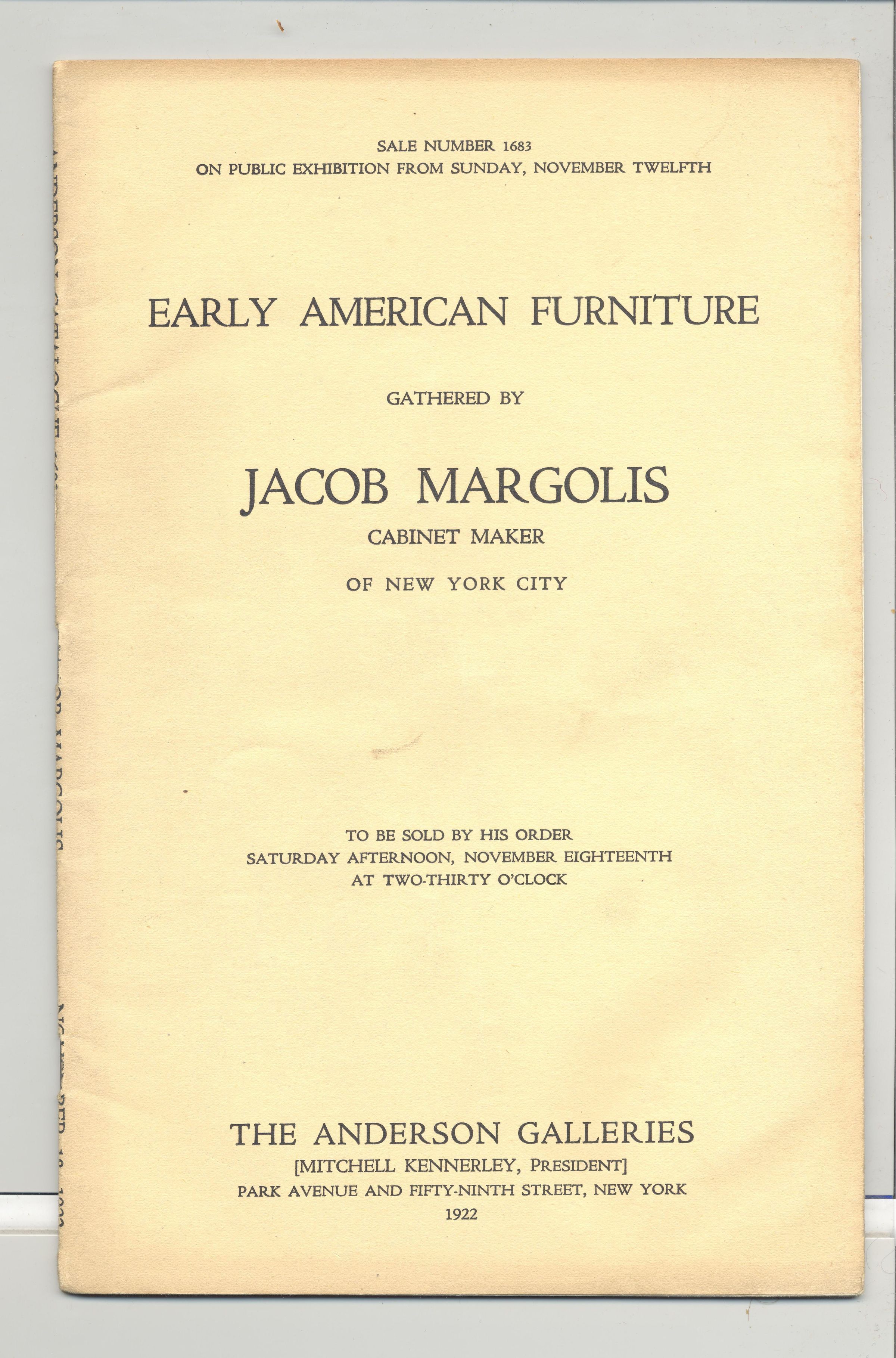 CAT, EARLY AMERICAN FURNITURE, 1922, NY. SALE 1683, JACOB MARGOLIS COLLECTION. THE ANDERSON GALLERIES, PRICES WRITTEN, 18 PP. 6 1/4" X 9 1/4"Created By