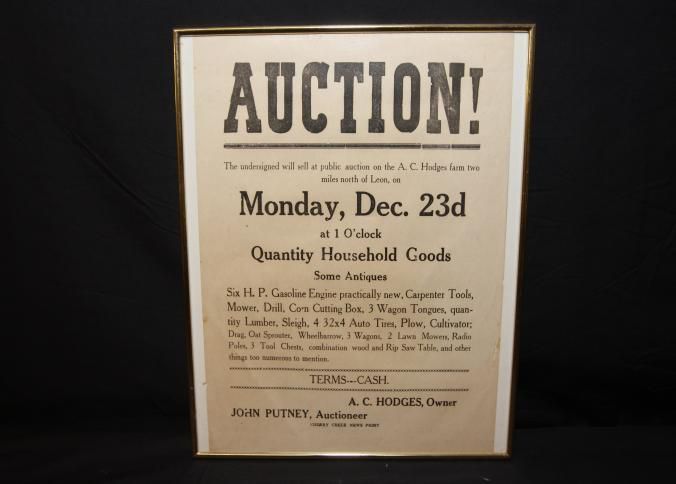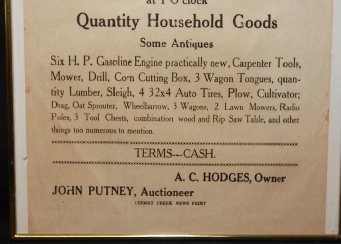 FR. 19THC FARM AUCTION BROADSIDE. 9X11 1/2". MON. DEC. 23D. - 1 O' CLOCK A. C. HODGES FARM SIX H.P. ENGINE PRACTICALLY NEW, CARPENTER TOOLS - MOWER - DRILL - CORN CUTTING BOX - 3 WAGON TONGUES - LUMBER - SLEIGH - AUTO TIRES - PLOW - CULTIVATOR - WAGONS. AUCTIONEER - JOHN PUTNEYCreated By