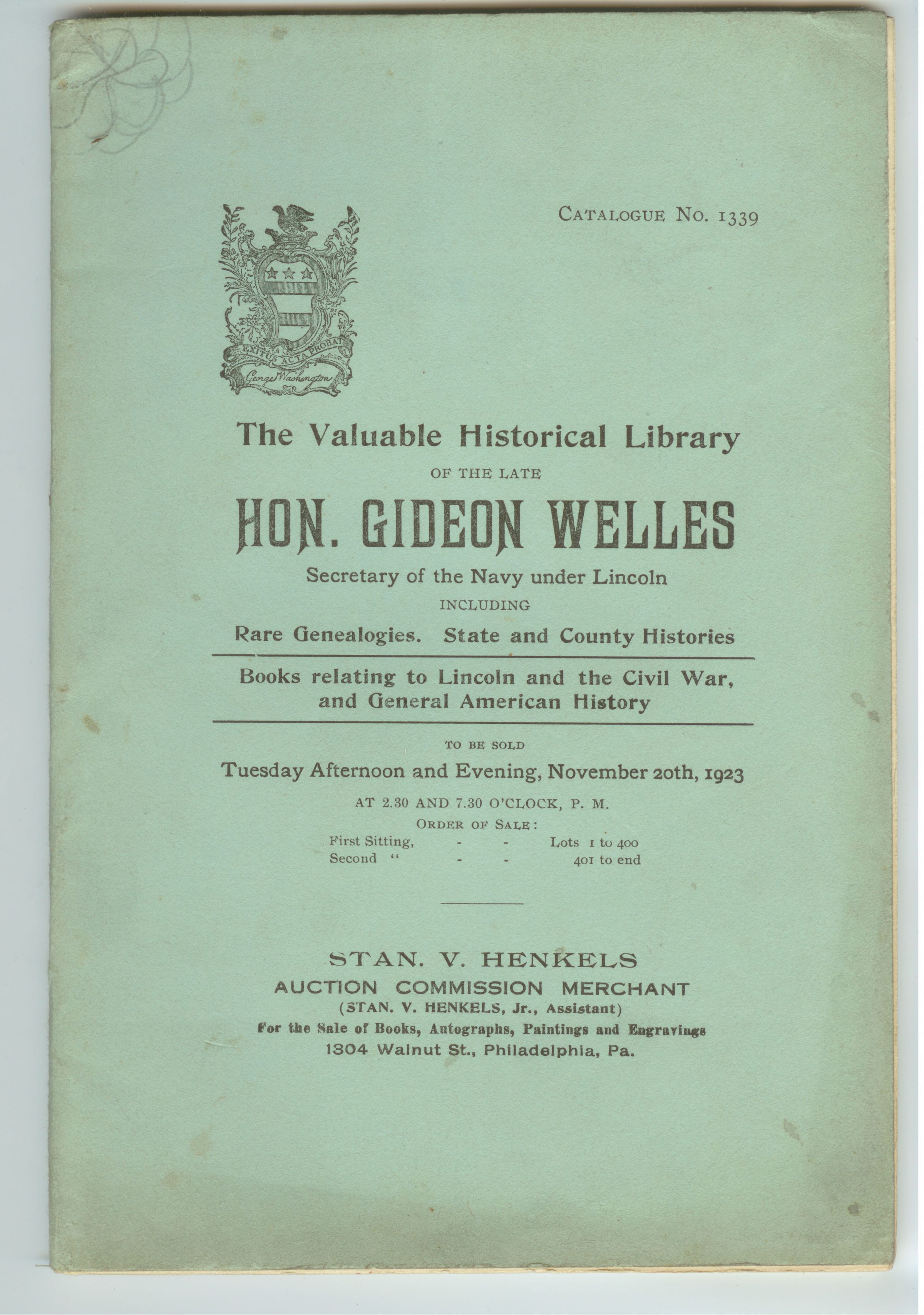 CAT, BOOKS, 1923, PA. VALUABLE HISTORICAL LIBRARY OF HON. GIDEON WELLES, SECRETARY OF NAVY UNDER LINCOLN. STAN HENKELS, AUCTIONEER. 60 PP. 6 3/4" X 10"Created By