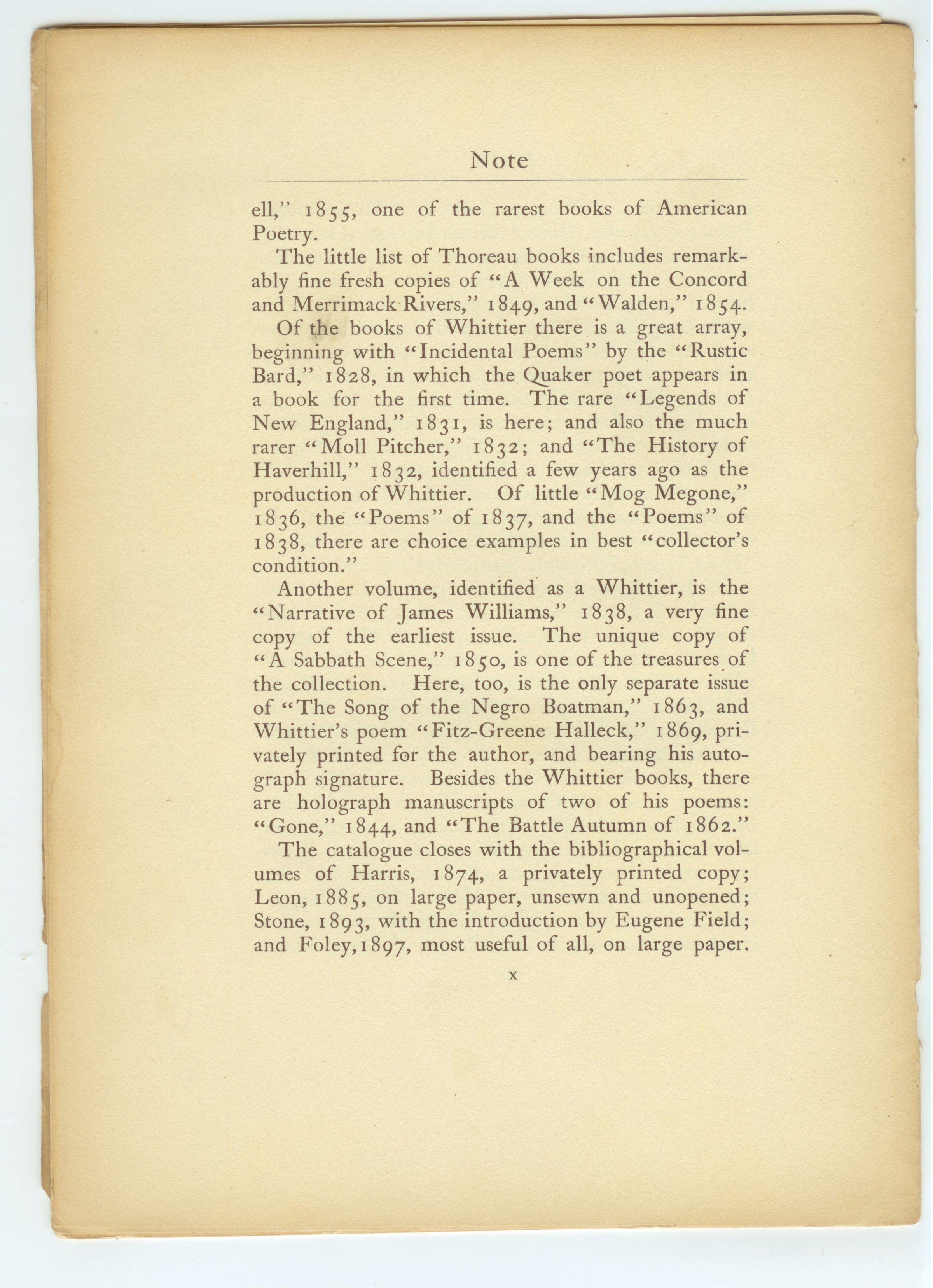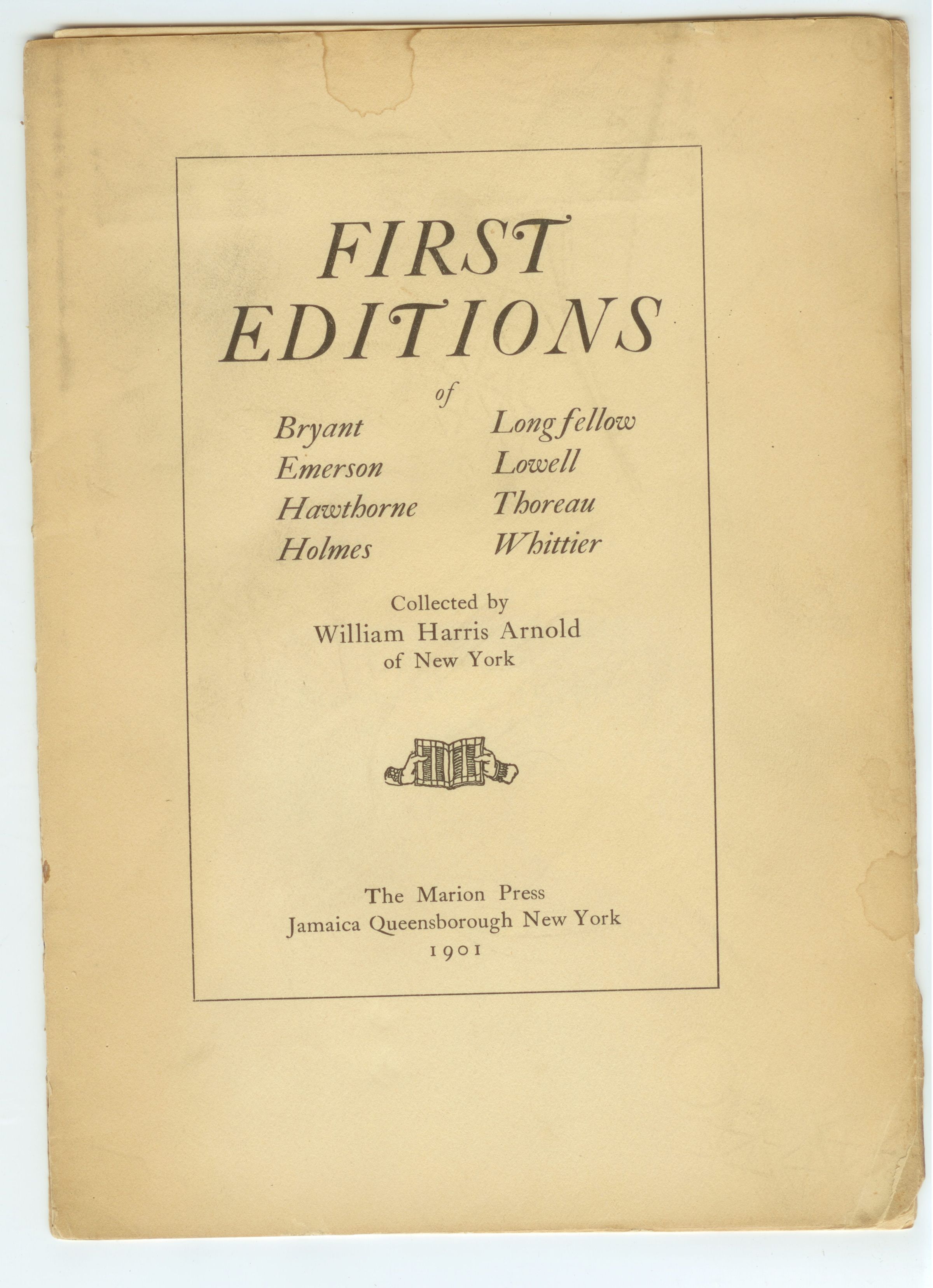 CAT, BOOKS, 1901, NY. PRICE LIST & BUYER NAMES OF FIRST EDITIONS OF THE WILLIAM HARRIS ARNOLD COLLECTION. 14 PP. 7" X 10"Created By