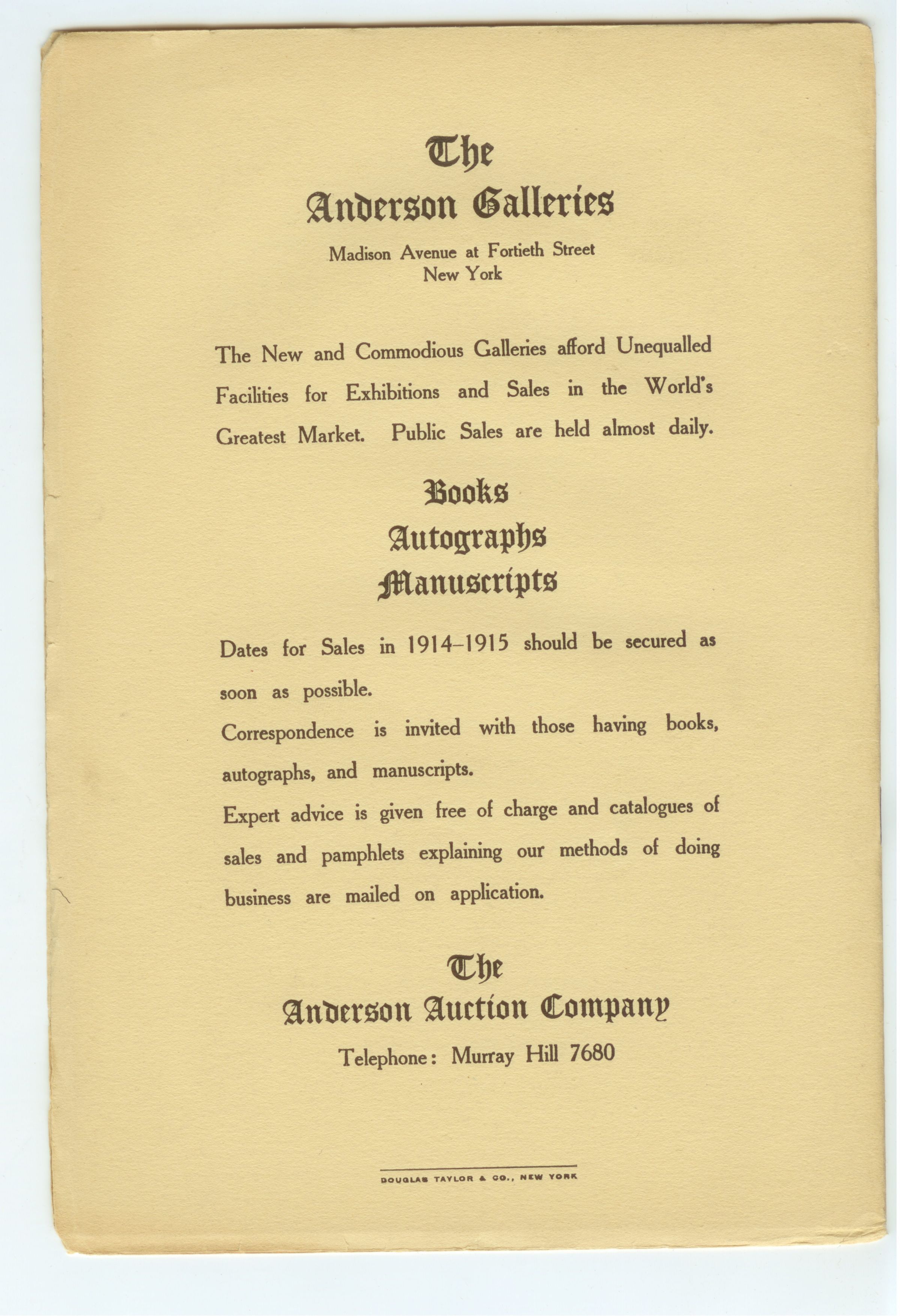 CAT, BOOKS, 1914, NY. SALE 1117, 28 PP. INCL INVOICE FROM ANDERSON GALLERIES. 6 1/4" X 9"