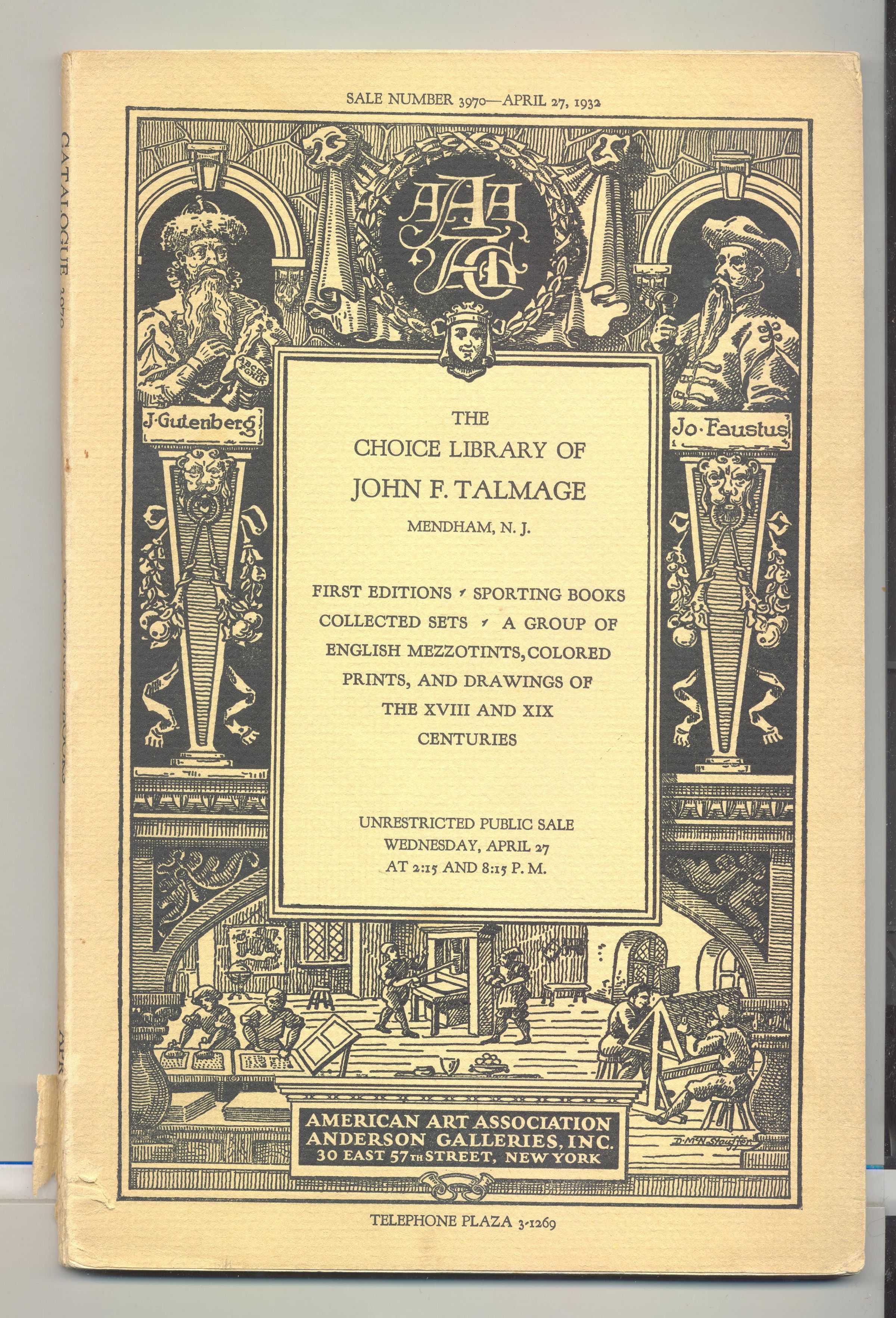CAT, BOOKS, 1932, NY. SALE 3970, CHOICE LIBRARY OF JOHN F. TALMAGE OF NJ. AMERICAN ART ASSOC, ANDERSON GALLERIES. NEWS CLIPPING INCL, 63 PP, B/W ILLUS. 6" X 9 1/4"Created By