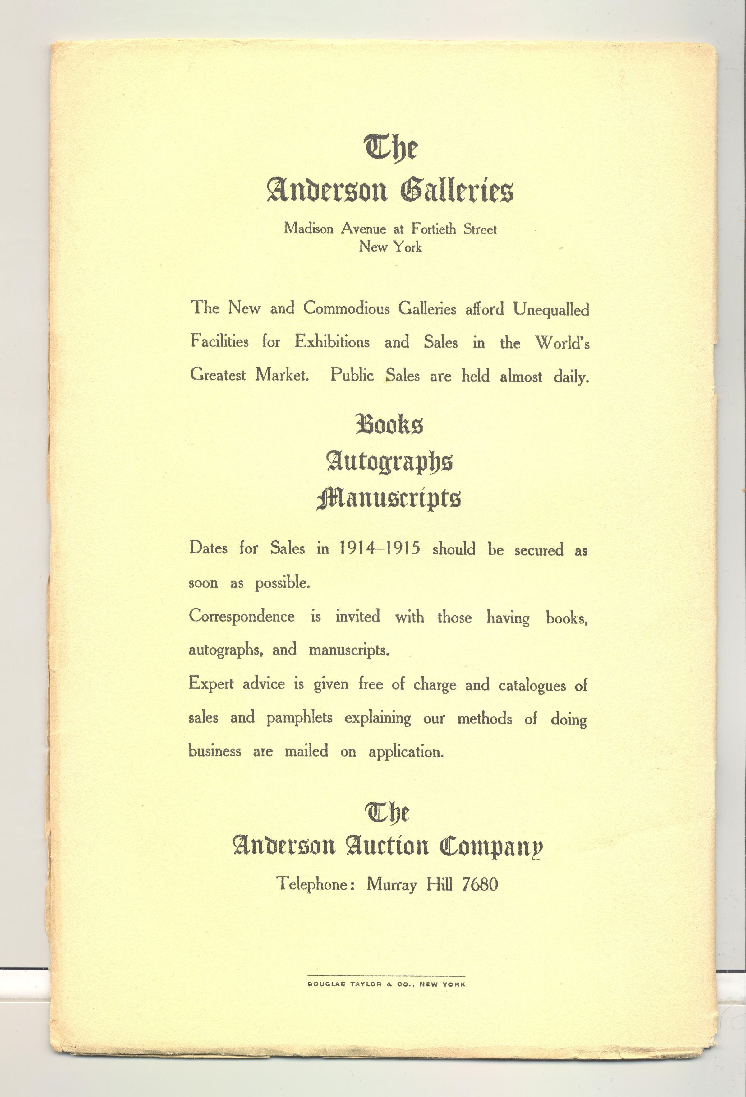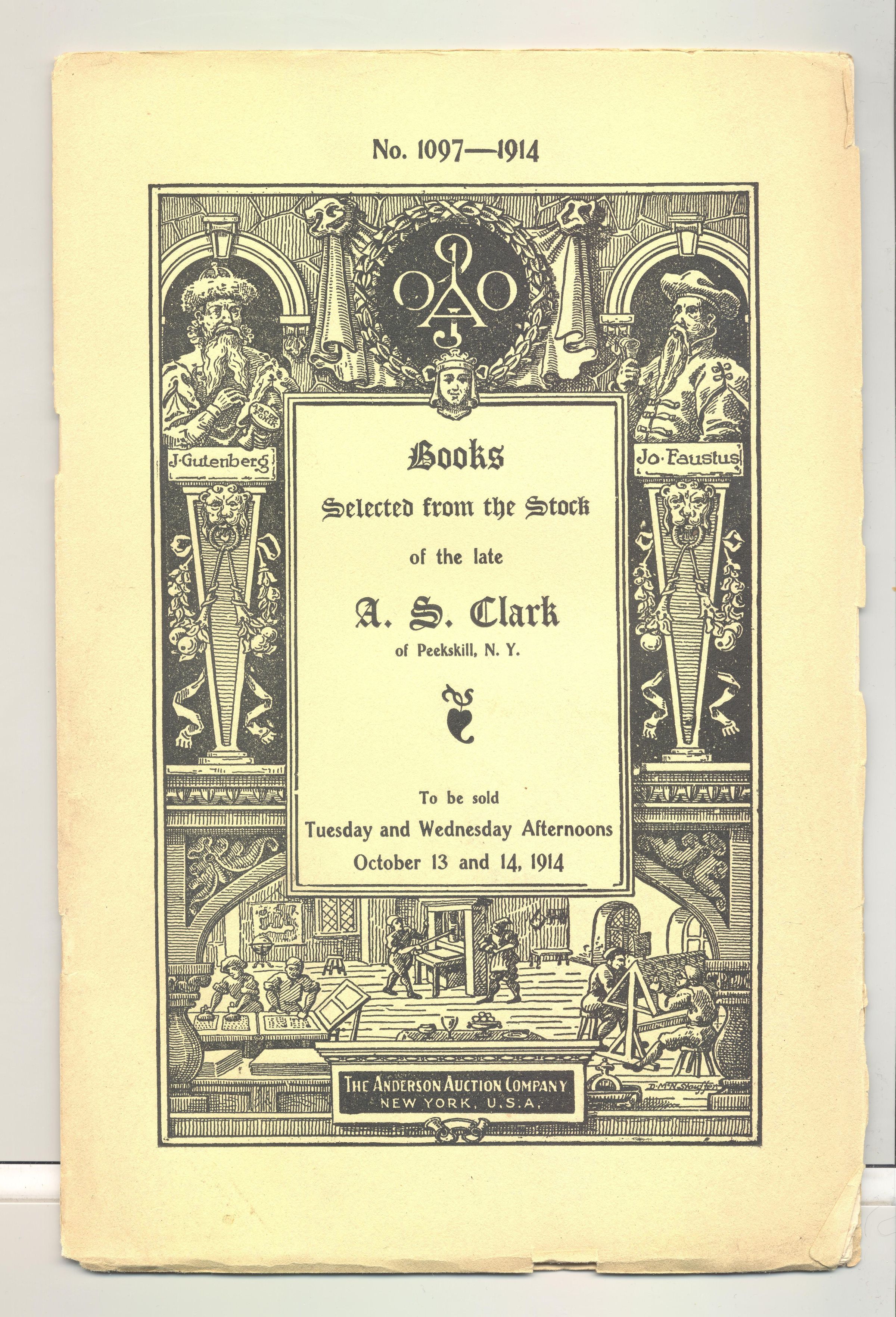 CAT, BOOKS, 1914, NY. SALE 1097. COLLECTION OF A.S. CLARK IN PEEKSKILL, NY. ANDERSON AUCTION CO. INVOICE INCL, 39 PP. 6 1/4" X 9 1/4"Created By