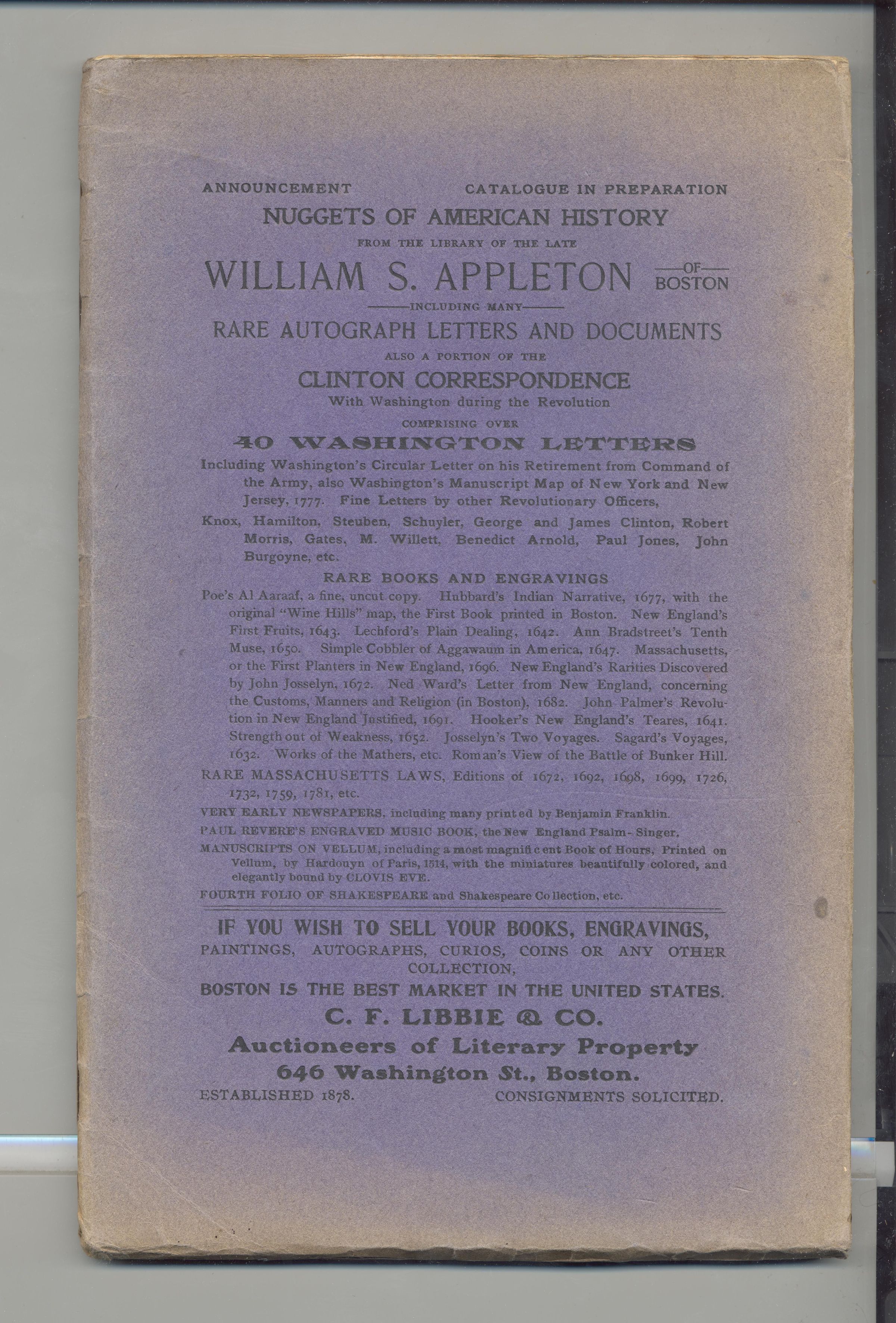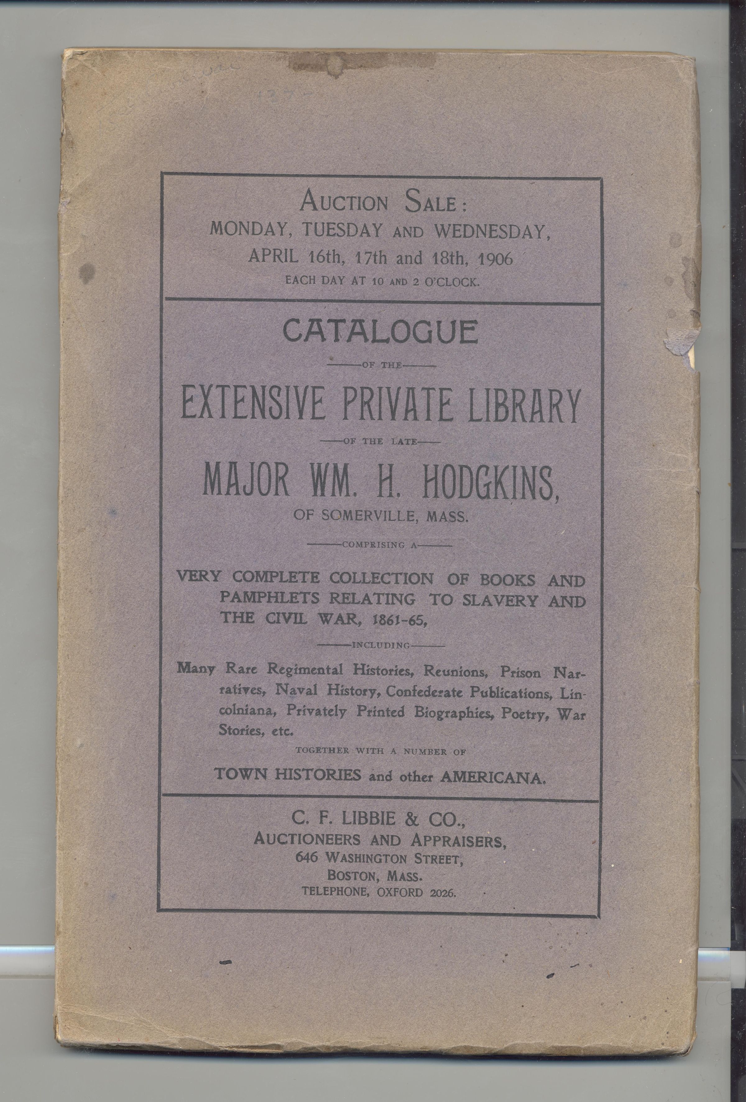 CAT, BOOKS, 1906, MA. EXTENSIVE PRIVATE LIBRARY, MAJ. WM. HODGKINS. BOOKS RELATING TO SLAVERY AND CIVIL WAR. C.F. LIBBIE & CO, AUCTIONEERS. 183 PP. 6" X 9 1/2"Created By