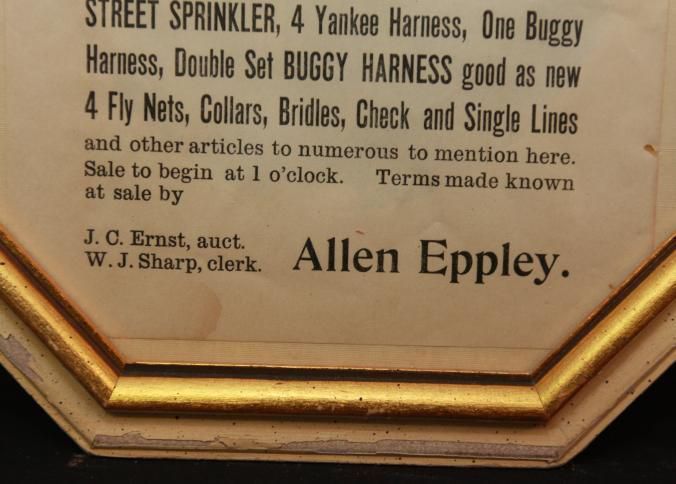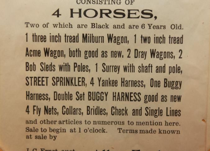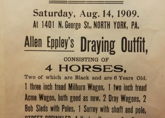 FR. 1909 PA FARM AUCTION BROADSIDE. 6X9" NORTH YORK, PA. AUCTIONEER J.C. ERNST. GREAT LISTING WITH "OTHER ARTICLES TOO NUMEROUS TO MENTION HERE." 1PM START.Created By