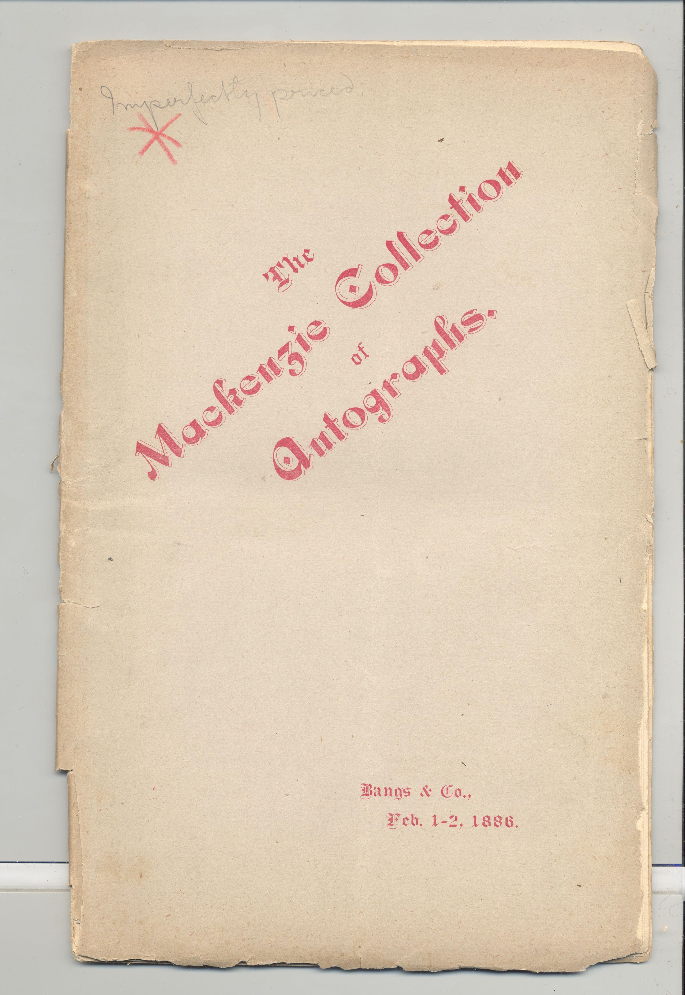 CAT, BOOKS, 1886, NY. THE MACKENZIE COLLECTION OF AUTOGRAPHS, BANGS & CO. 31 PP. 6 1/4" X 9 1/2"Created By