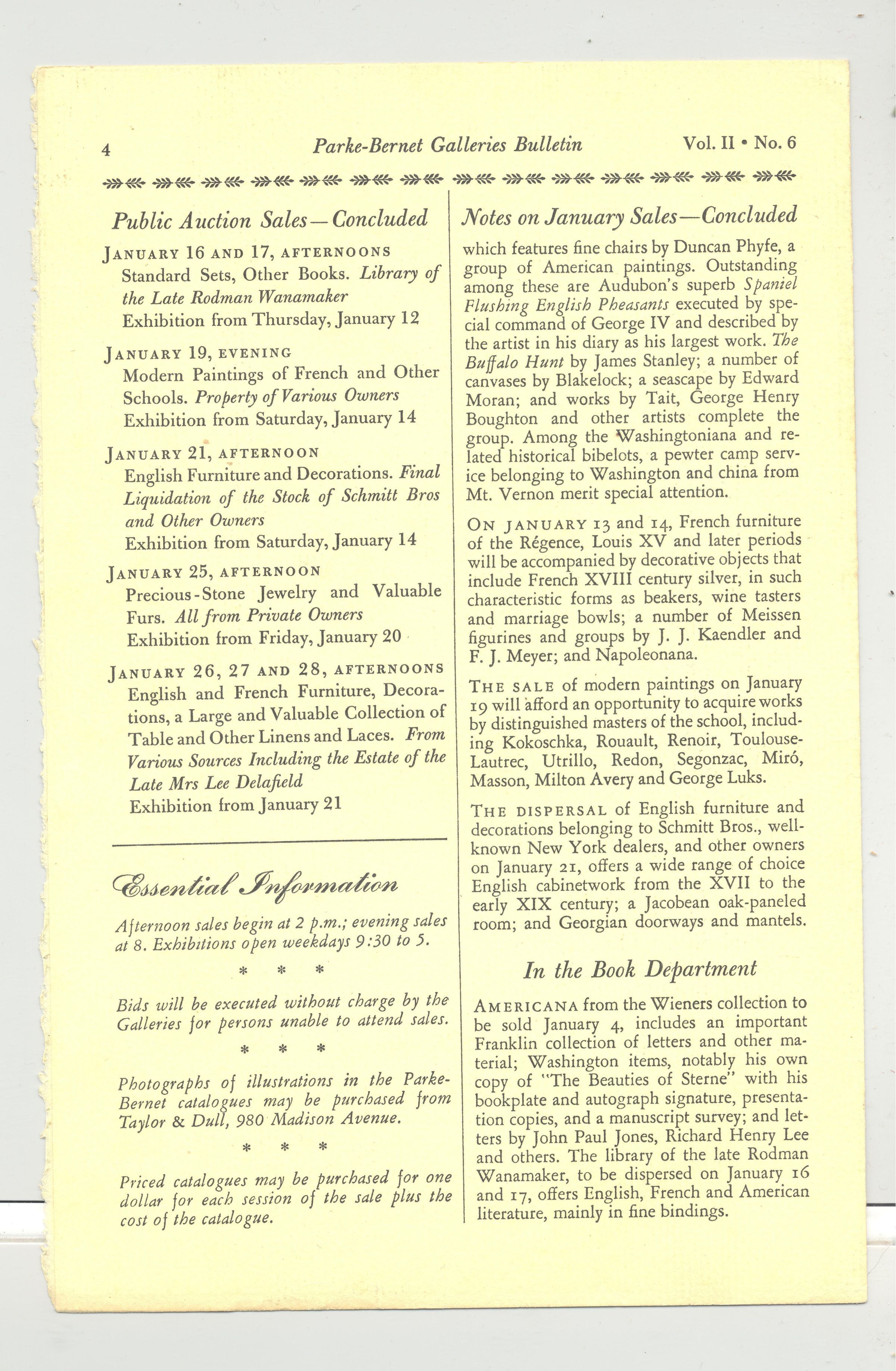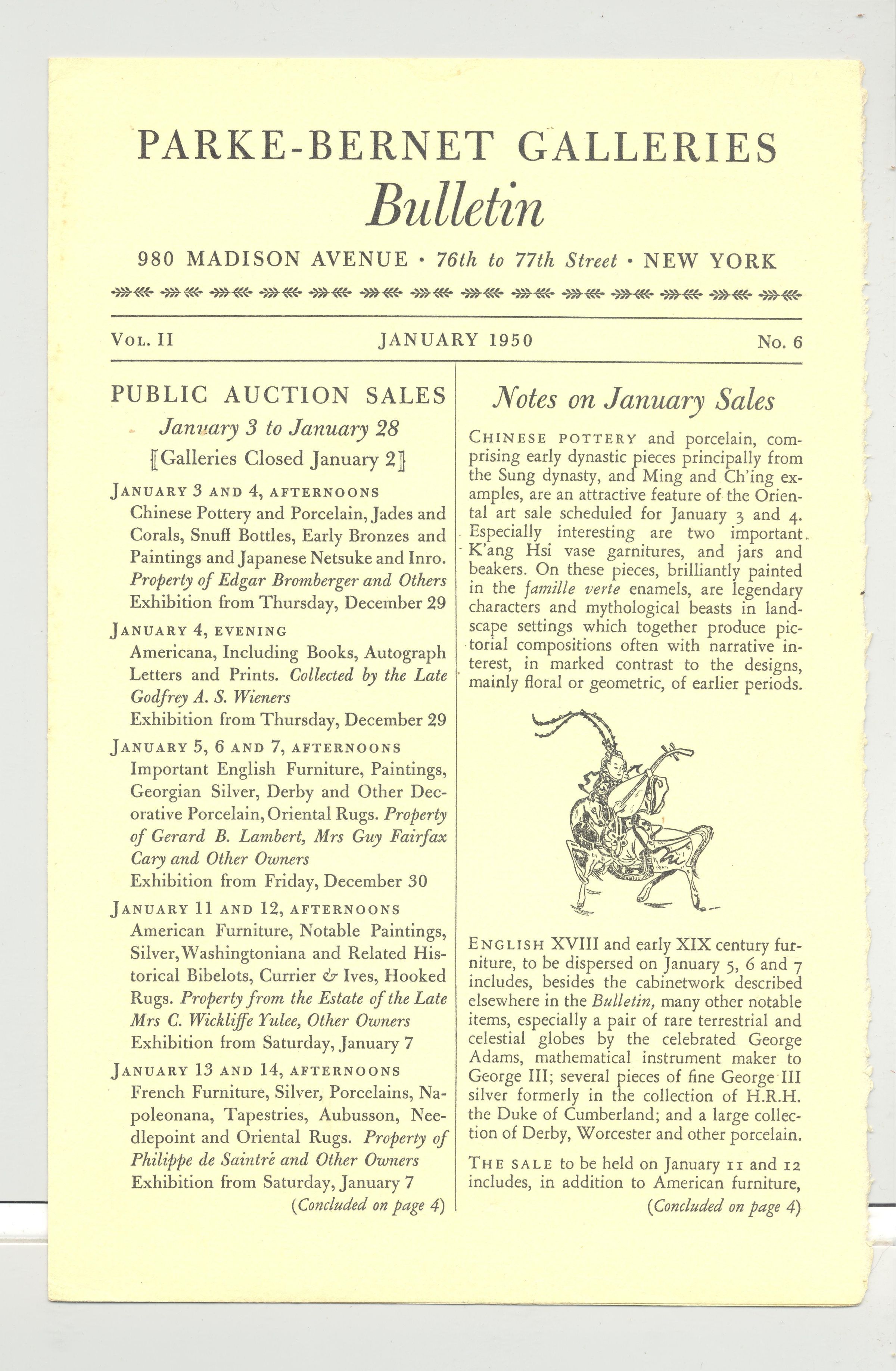 DOC, AUCTION CALENDAR, NY, 1950. PUBLIC AUCTION SALE DATES IN JANUARY. ONE PAGE, PARKE-BERNET GALLERIES BULLETIN, 6" X 9 1/4"Created By