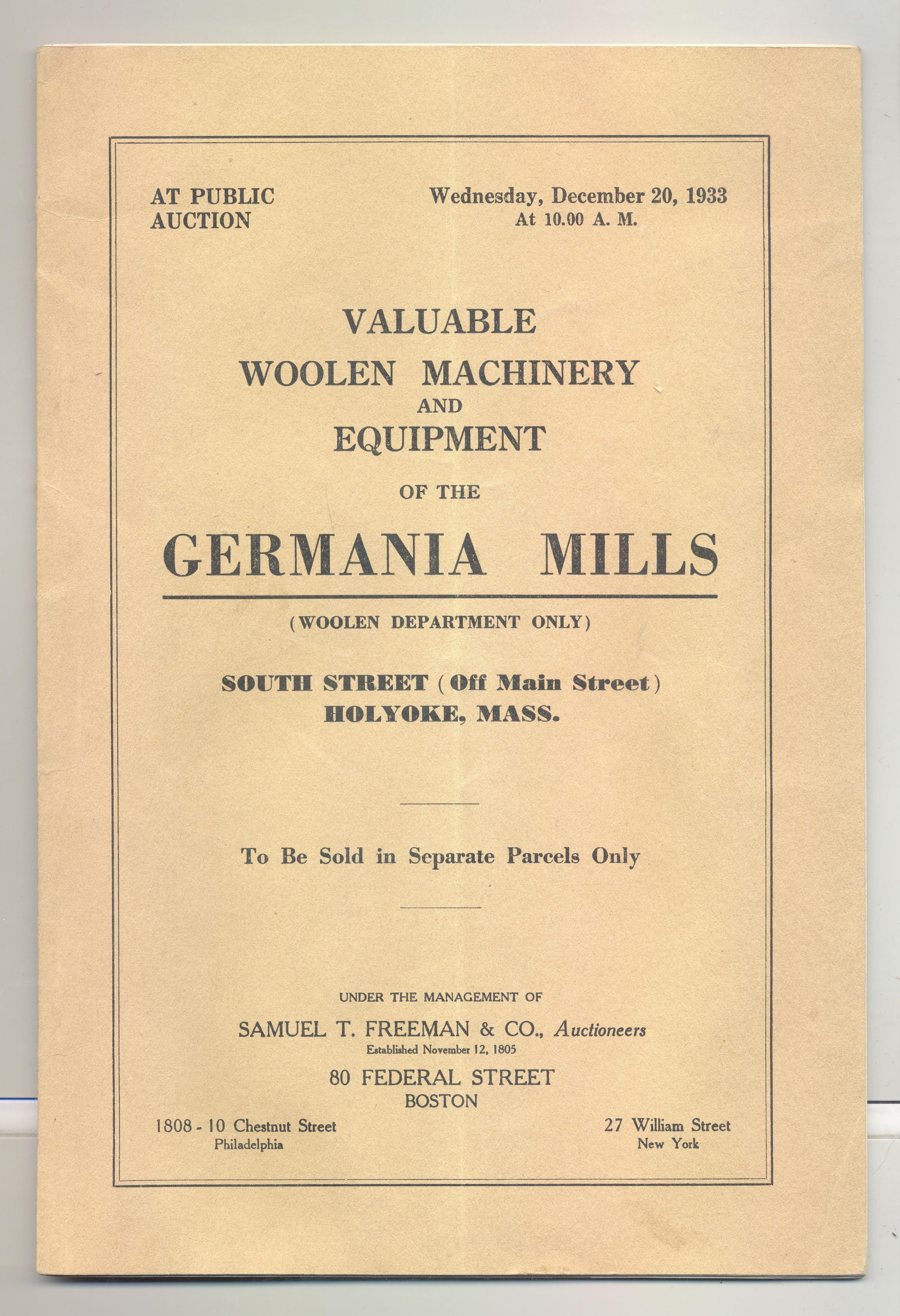 CAT, EQUIPMENT, 1933, MA. VALUABLE WOOLEN MACHINERY AND EQUIPMENT OF THE GERMANIA MILLS, HOLYOKE, MA. SAMUEL FREEMAN & CO, AUCTIONEERS. ILLUS, 22 PP. 6 3/4" X 10"Created By