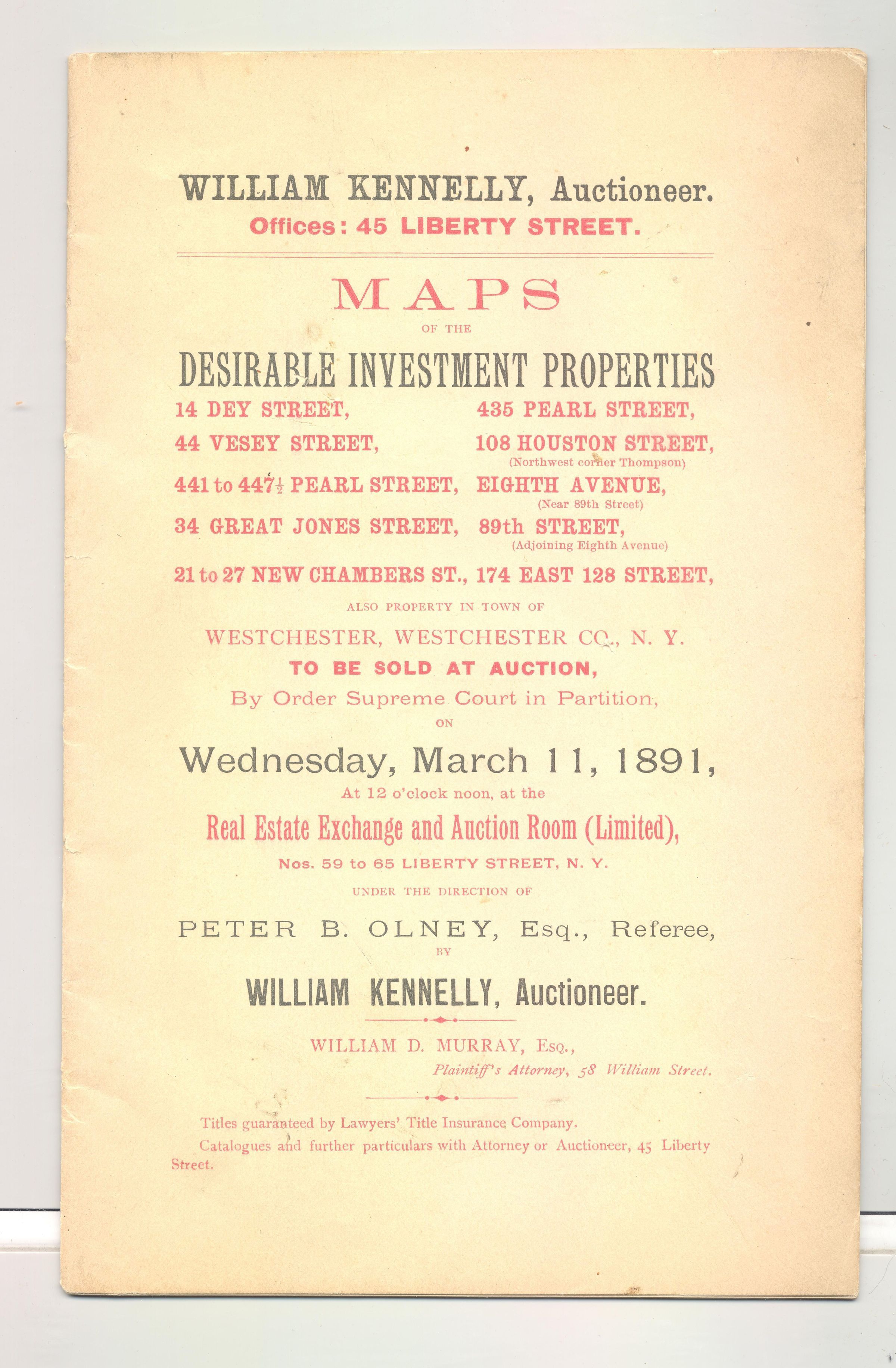 CAT, REAL ESTATE, 1891, NY. WILLIAM KENNELLY, AUCT. BKLT OF MAPS, 21 PP. 6" X 9"
