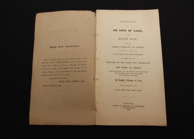 CAT, LAND, 1845, MA. 132 LOTS OF LAND IN THE SOUTH COVE. 8 PP, 5 1/2" X 9 1/4", MAP INCL 19 1/4" X 15 1/2"Created By