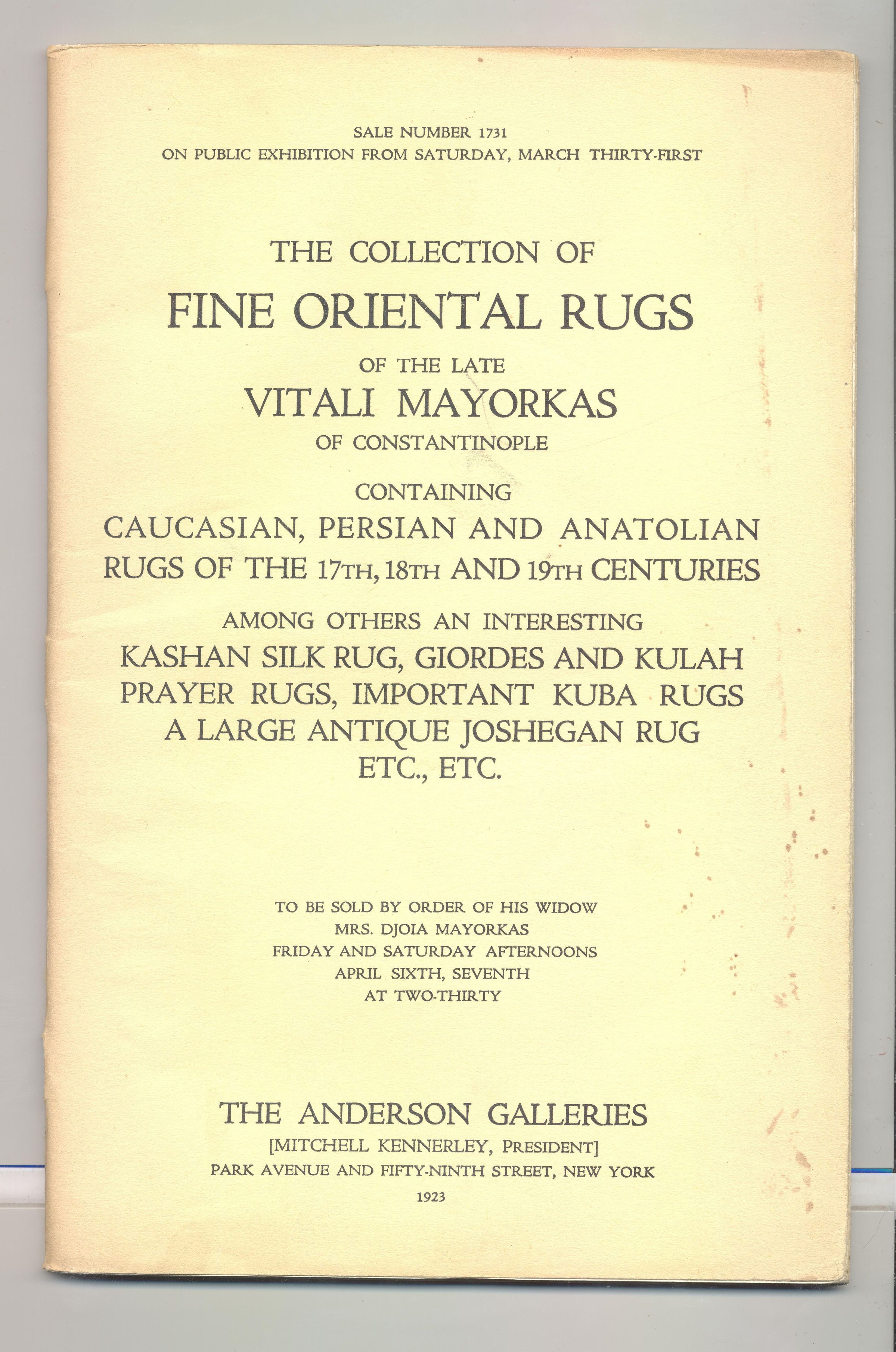 CAT, RUGS, 1923, NY. ANDERSON GALLERIES SALE NO. 1731, FINE ORIENTAL RUGS. CHAPMAN, AUCTIONEER. FIRST SESSION PRICED. 42 PP ILLUS, 6 1/4" X 9 1/4"Created By