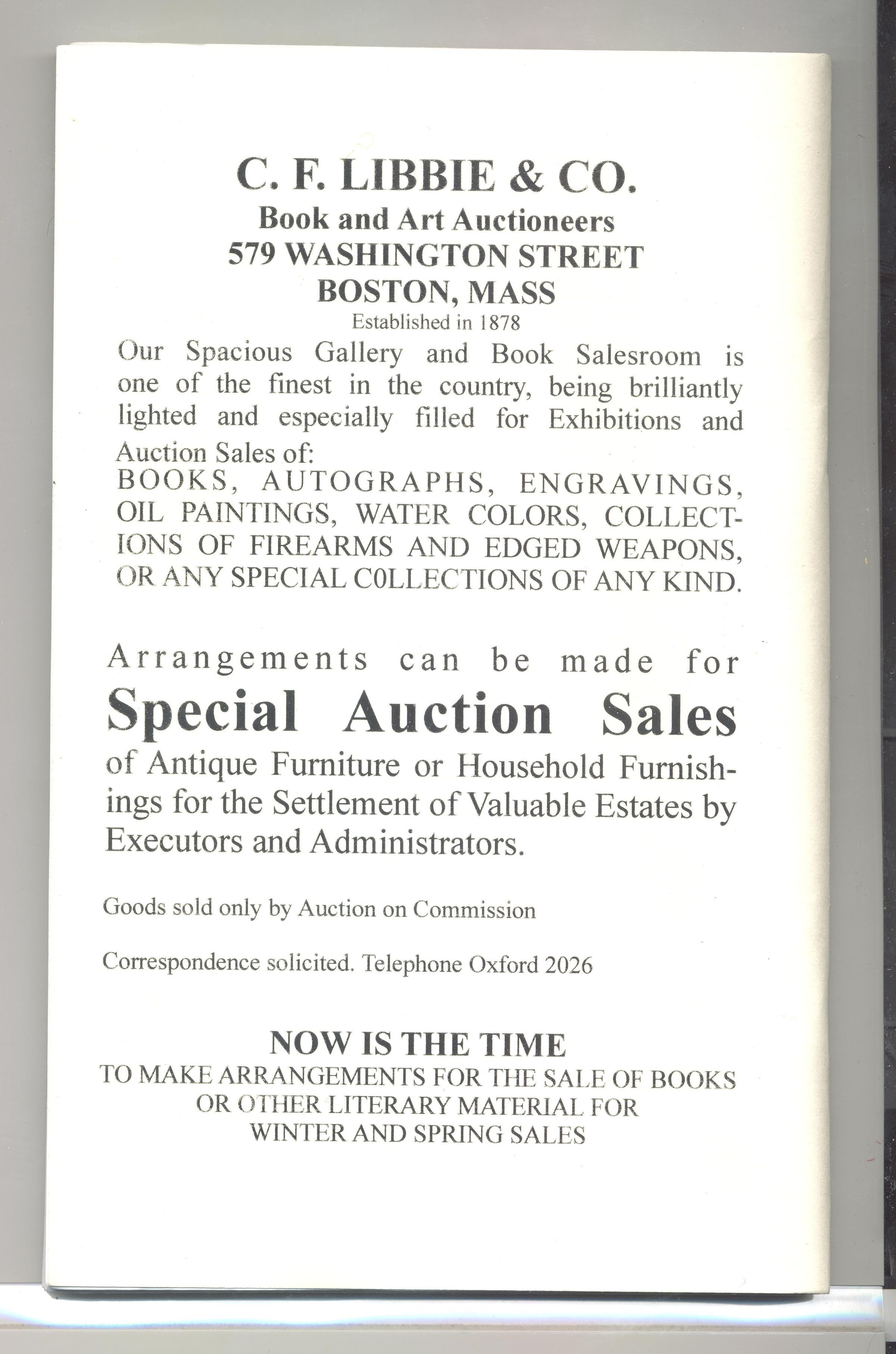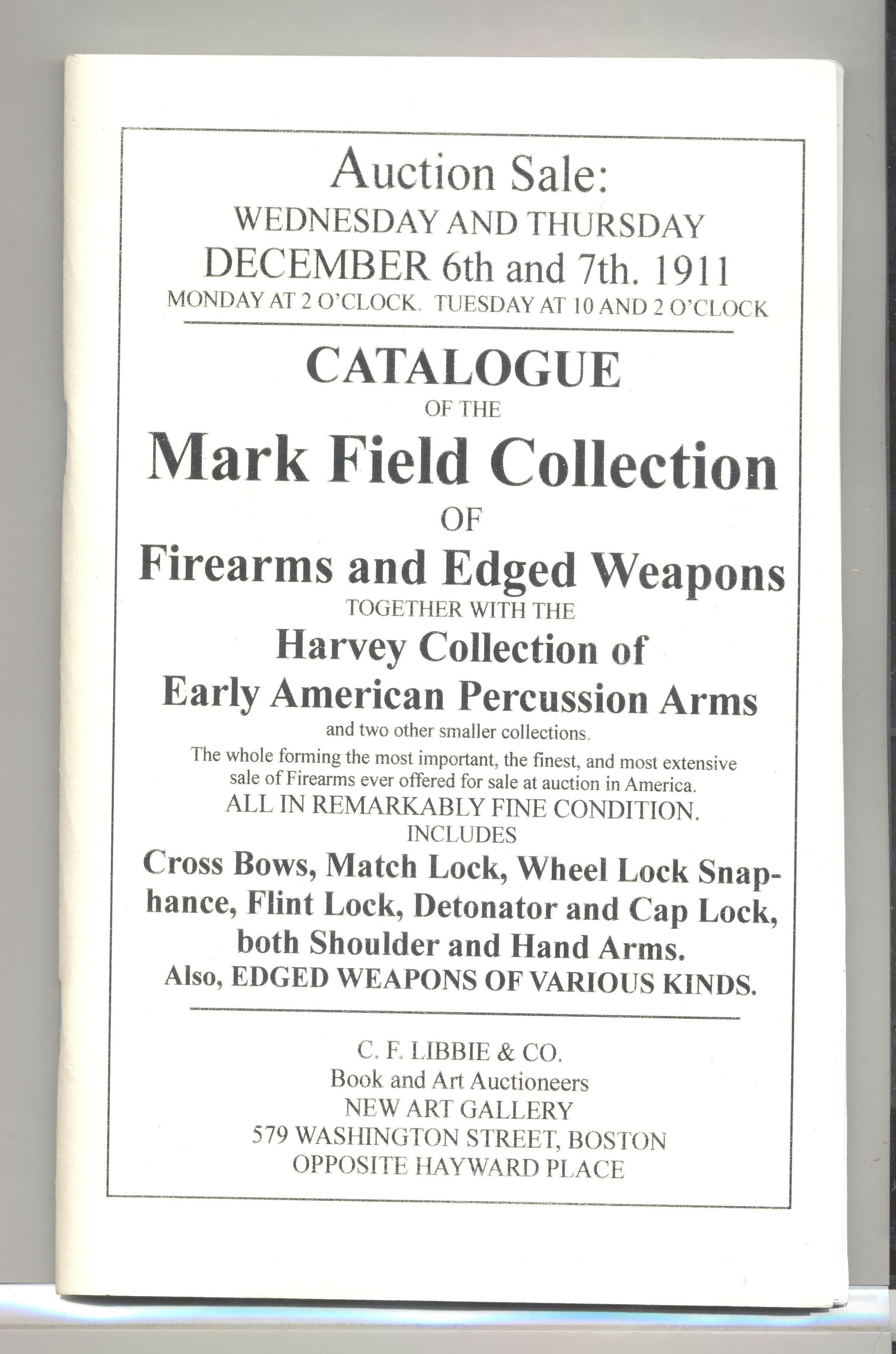 CAT, FIREARMS, 1911, MA. MARK FIELD COLLECTION OF FIREARMS & EDGED WEAPONS. C.F. LIBBIE & CO, AUCTS. PHOTOGRAPHED, 96 PP. 5 1/2" X 8 1/2"Created By