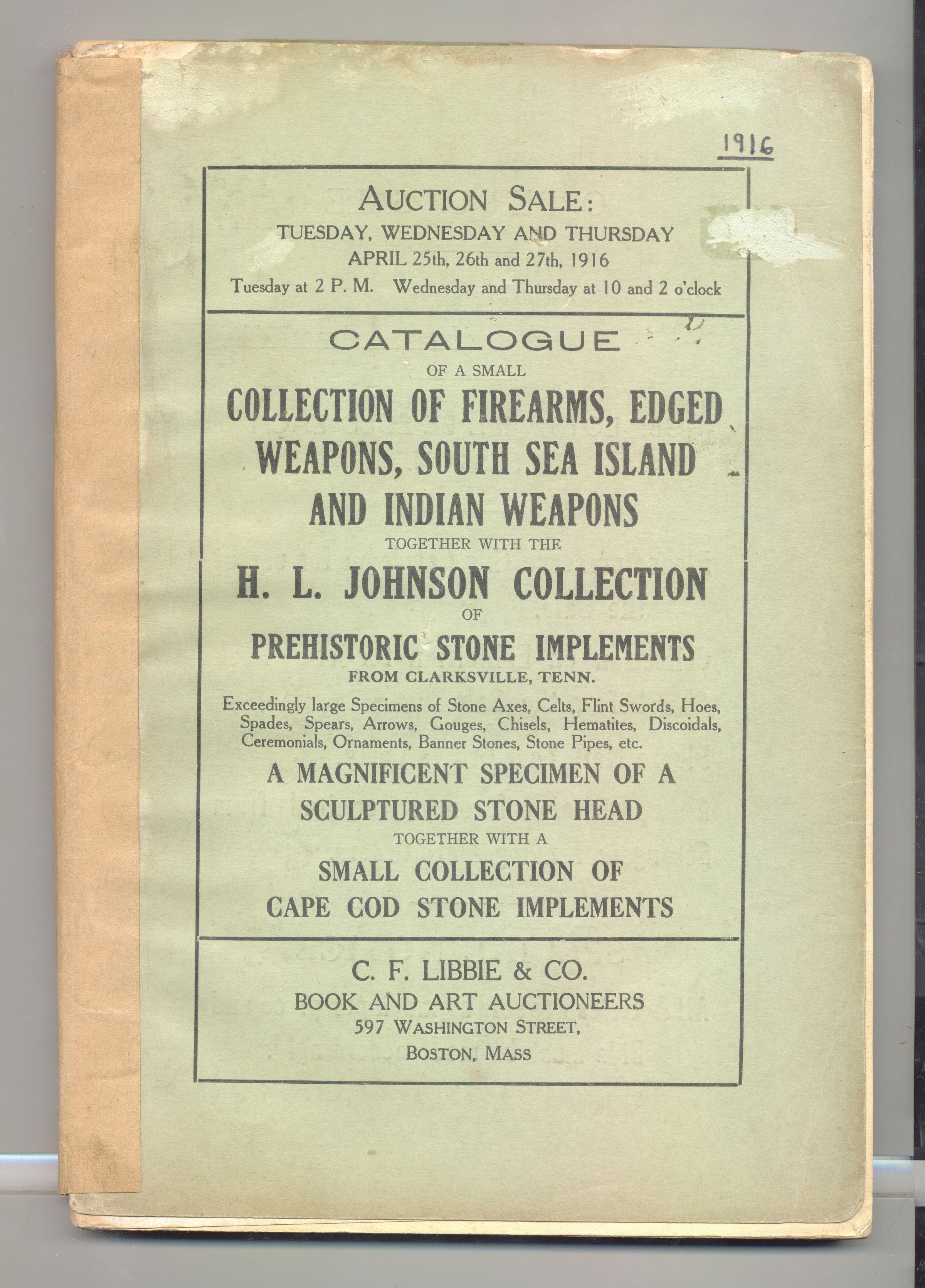 CAT, FIREARMS, 1916, MA. EDGED WEAPONS, SOUTH SEA ISLAND AND INDIAN WEAPONS, PREHISTORIC STONE IMPLEMENTS. C.F. LIBBIE & CO, AUCTS. PHOTOS, 107 PP, 6 1/4" X 9 1/4"Created By