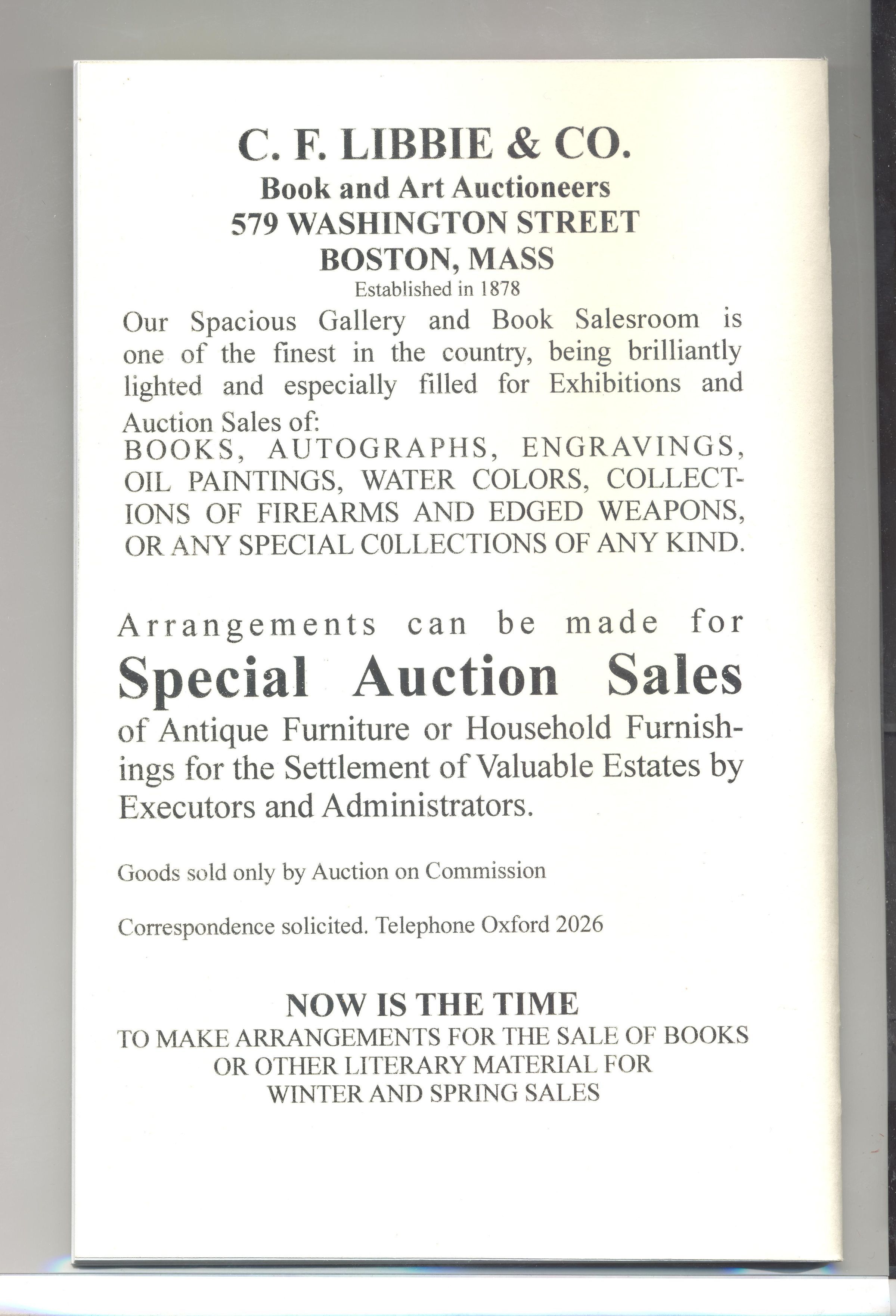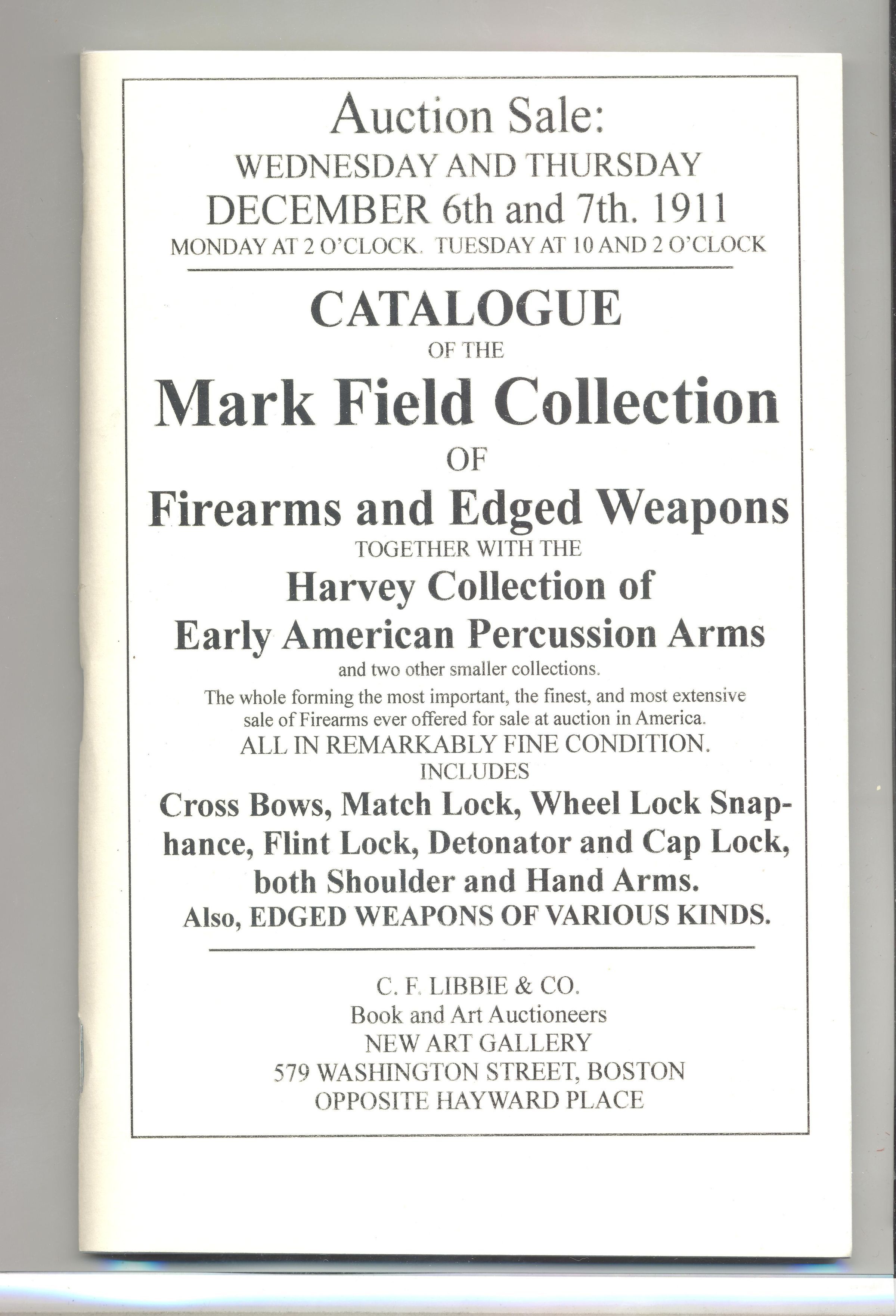 CAT, FIREARMS, 1911, MA. MARK FIELD COLLECTION OF FIREARMS & EDGED WEAPONS. C.F. LIBBIE & CO, AUCTS. PHOTOGRAPHED, 83 PP. 5 1/2" X 8 1/2"Created By