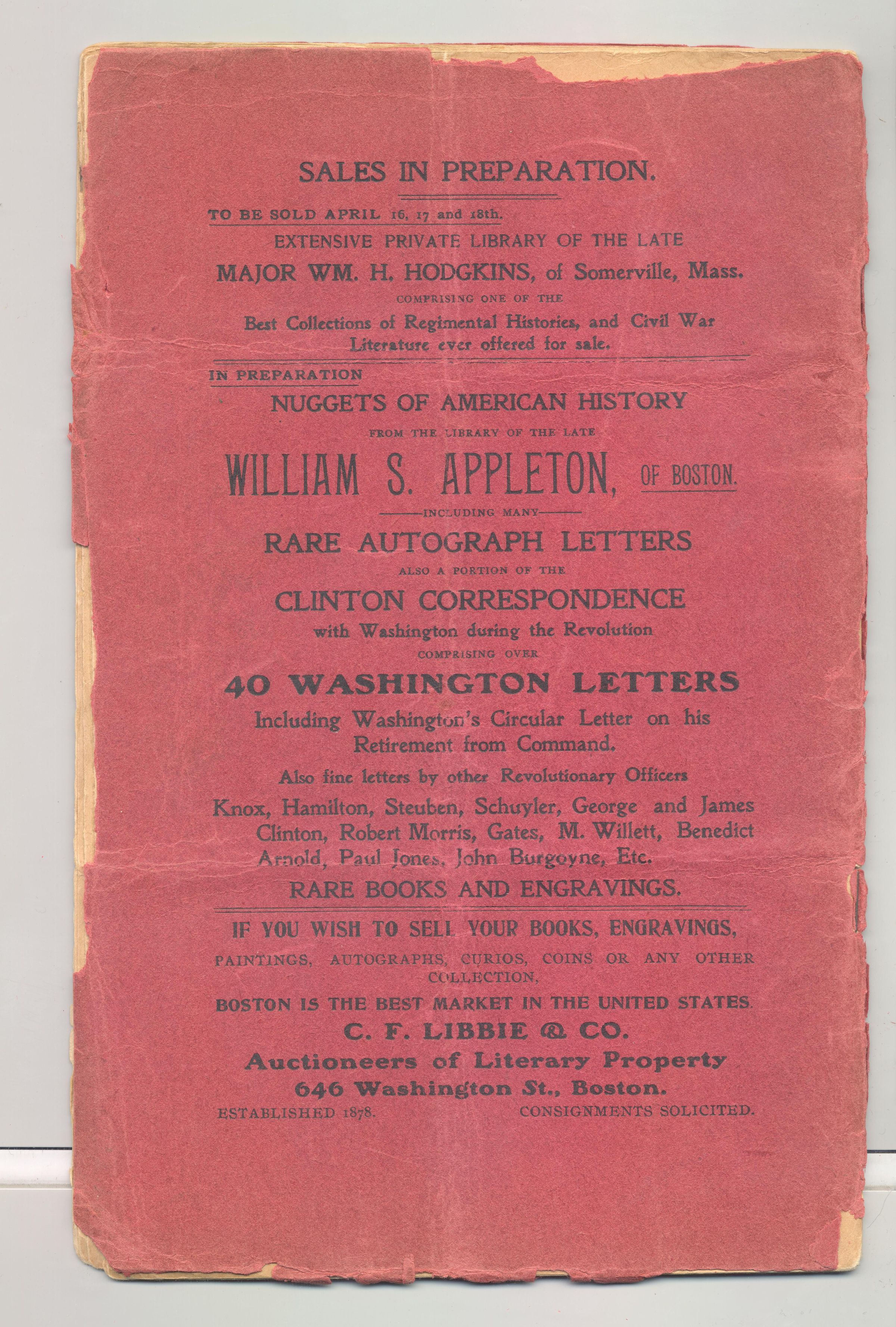 CAT, WEAPONS, 1906, MA. THE EDWARD FIELD COLLECTION OF AMERICAN AND FOREIGN ANTIQUE FIRE ARMS, SWORDS, WAR RELICS, INDIAN STONE WEAPONS, CURIOS, ETC. C.F. LIBBIE & CO, AUCTS. PRICED, 26 PP. 6" X 9 1/2"Created By