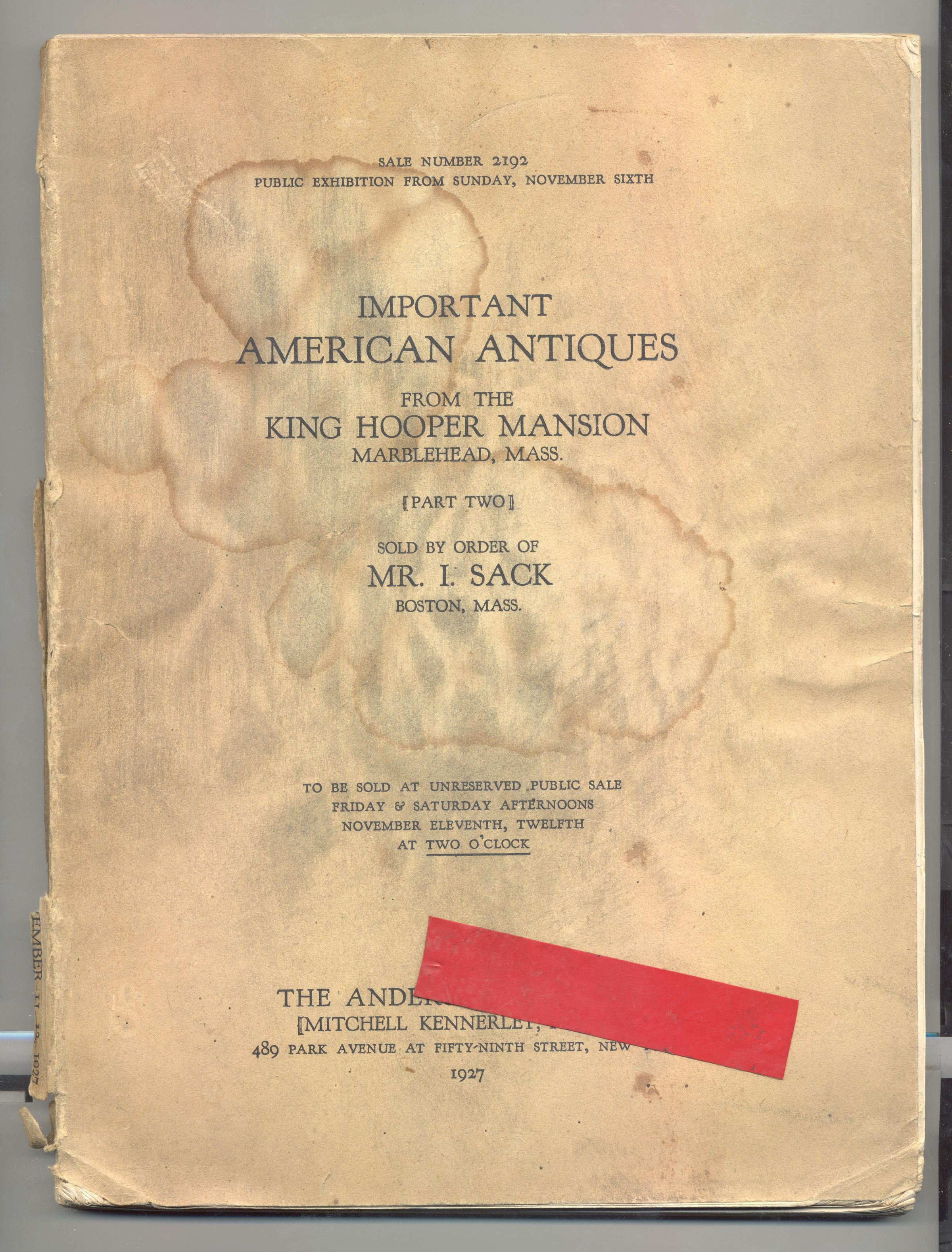 CAT, ANTIQUES, 1927, NY. ANDERSON GALLERIES, SALE NO. 2192, IMPORTANT AMERICAN ANTIQUES FROM THE KING HOOPER MANSION, MARBLEHEAD, MA. ILLUS, 141 PP. 7 1/2" X 10"Created By