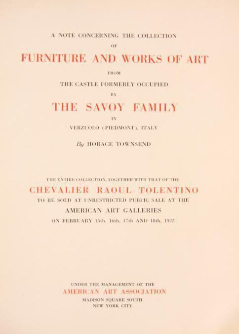 CAT, FURNITURE, 1922, NY. WORKS OF ART FROM THE CASTLE FORMERLY OCCUPIED BY THE SAVOY FAMILY, ITALY. AMERICAN ART ASSOC. PHOTOS, 28 PP. 8" X 11"Created By