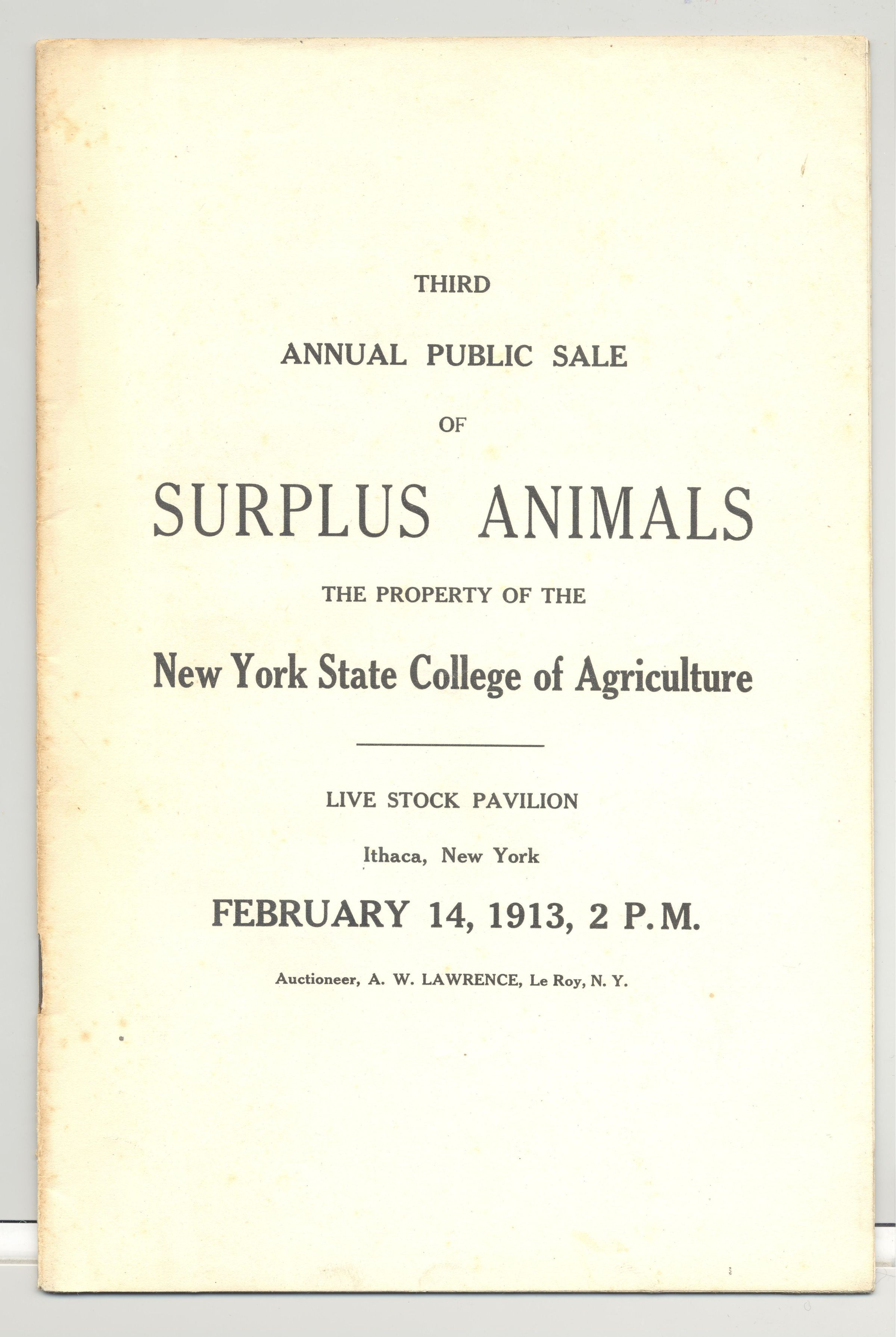CAT, LIVESTOCK, 1913, NY. THIRD ANNUAL PUBLIC SALE OF SURPLUS ANIMALS. PROP OF NY STATE COLLEGE OF AGRICULTURE. PRICED, 23 PP. 6" X 9"Created By