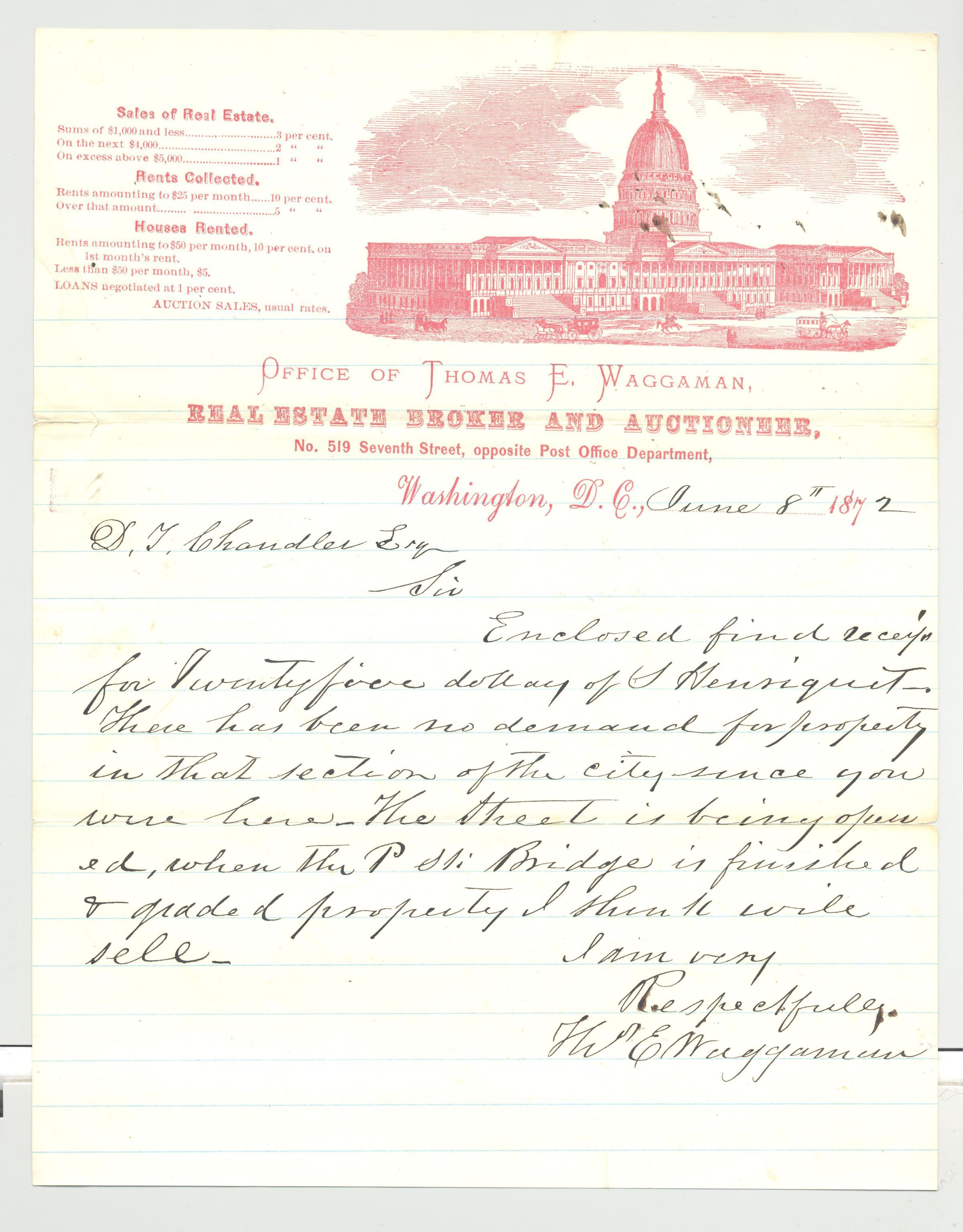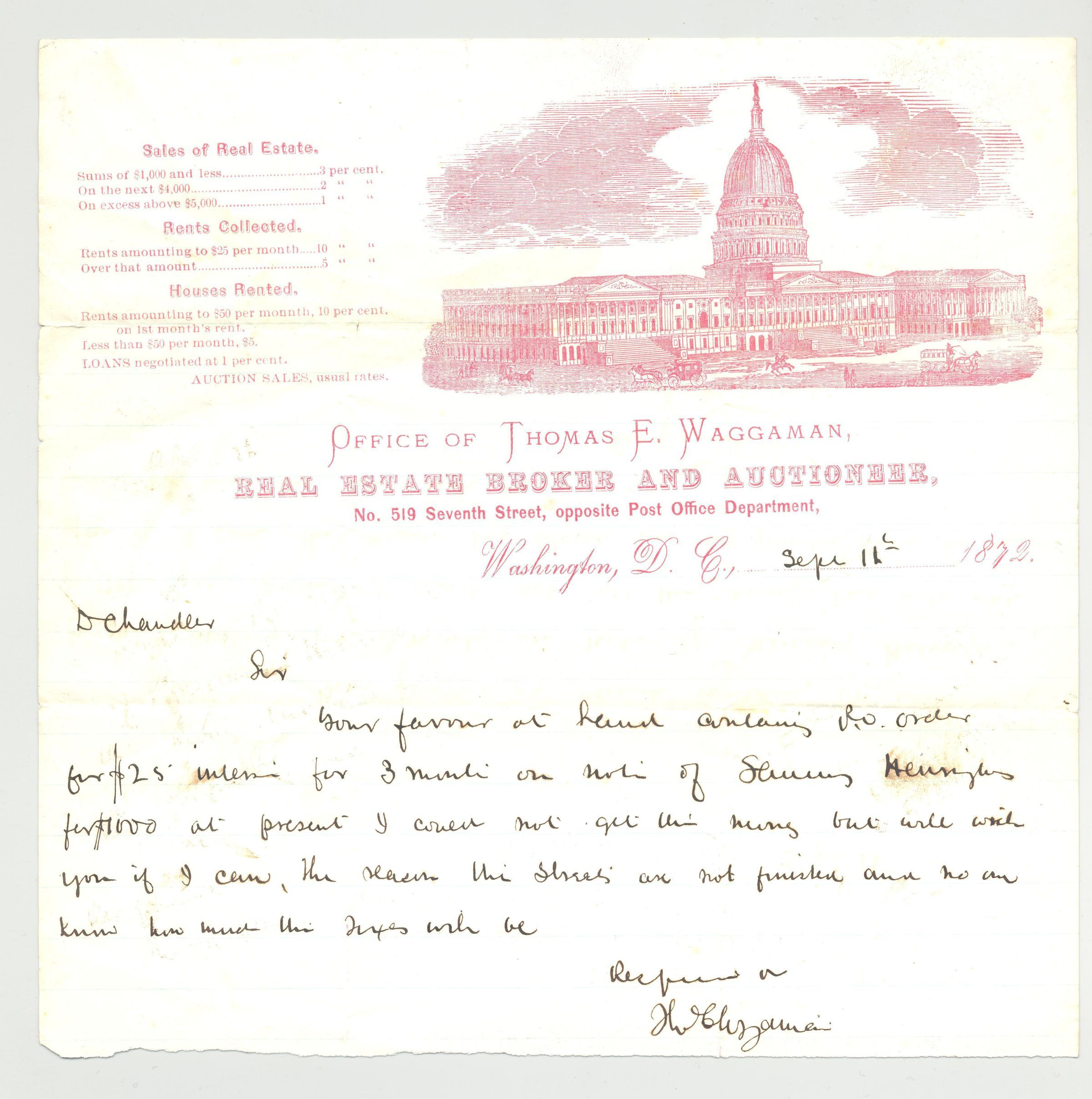 DOCS, LETTERHEAD, 1872, WASHINGTON DC. OFFICE OF THOMAS E. WAGGAMAN, REAL ESTATE BROKER AND AUCTIONEER.Created By