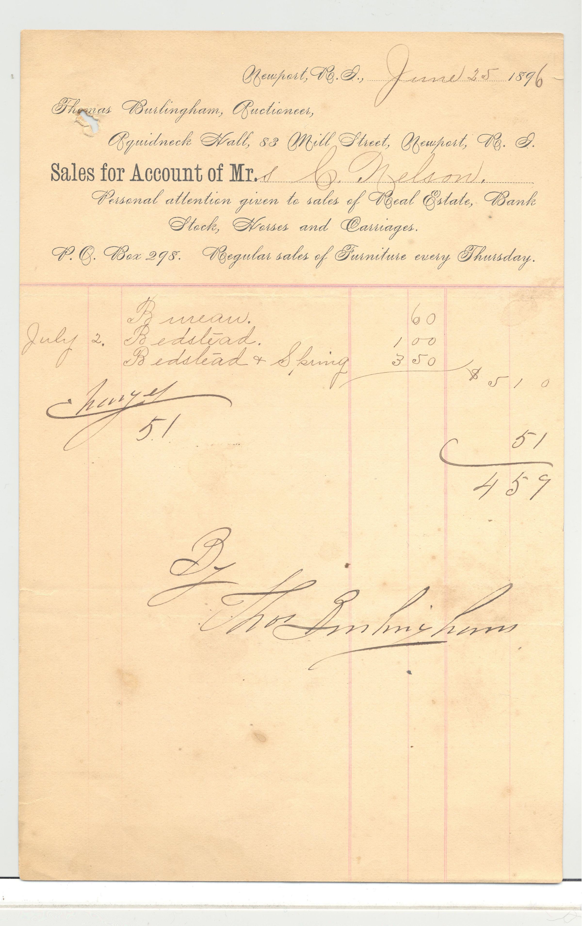 DOC, RECEIPT, 1896, RI. THOMAS BURLINGHAM, AUCTIONEER OF REAL ESTATE, BANK STOCK, HORSES & CARRIAGESCreated By