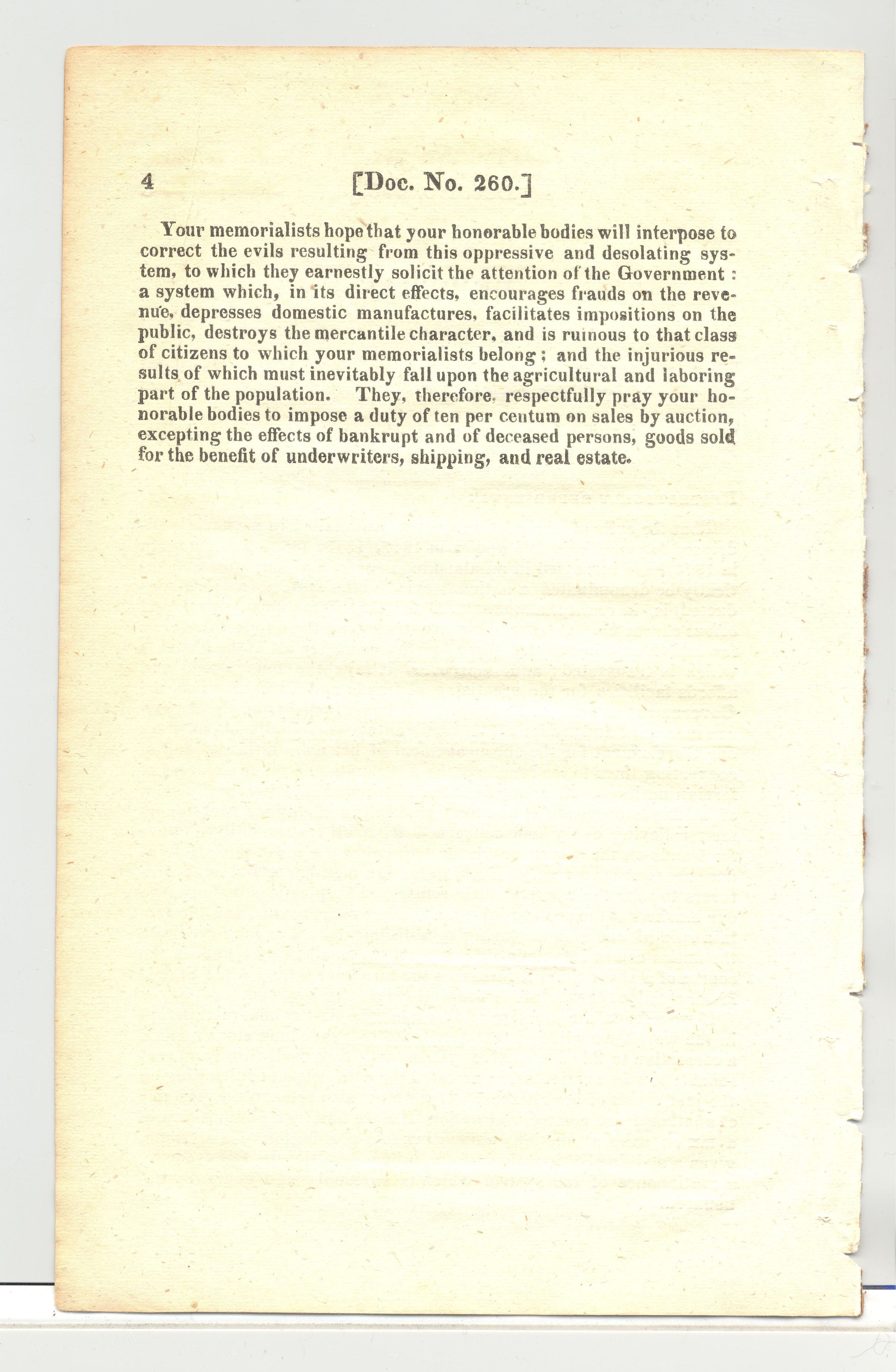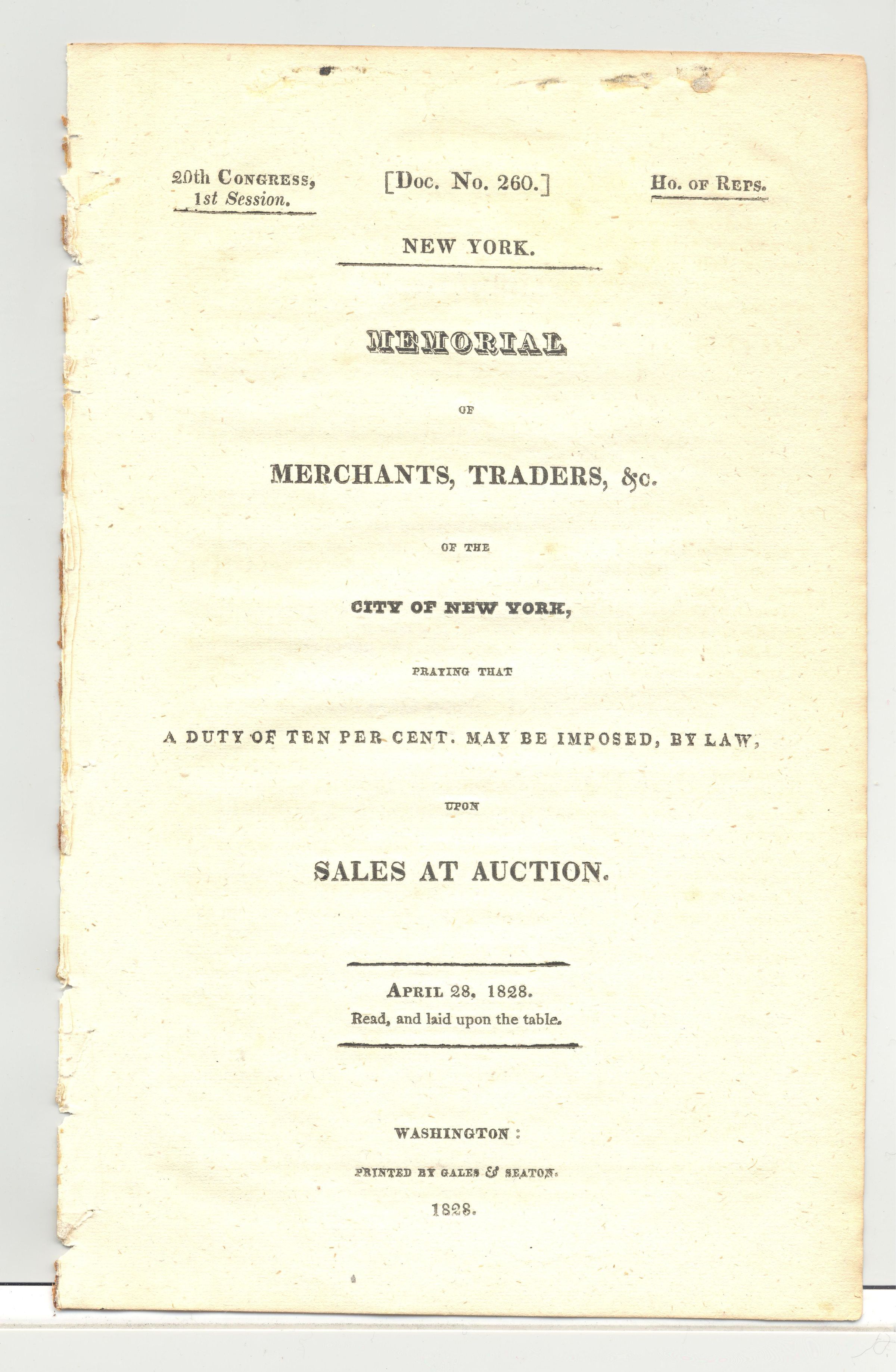 DOC, POLITICAL, 1828, NY. MEMORIAL OF MERCHANTS, TRADERS, ETC. OF THE CITY OF NY, PRAYING THAT A DUTY OF 10 % MAY BE IMPOSED BY LAW UPON SALES AT AUCTION. 2 PP. 5 1/2" X 8 3/4"Created By