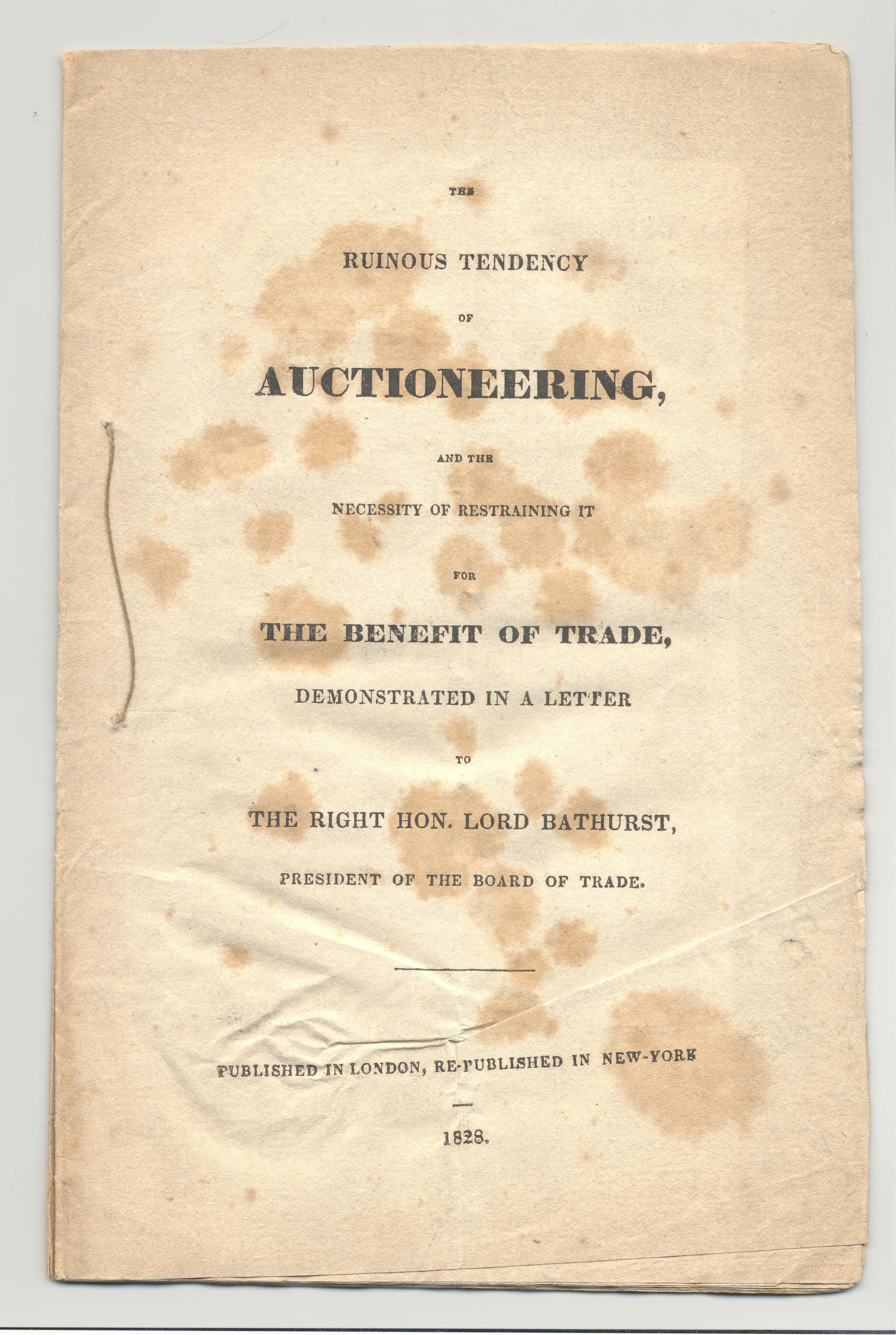 BKLT, POLITICAL, 1828, NY. THE RUINOUS TENDENCY OF AUCTIONEERING AND THE NECESSITY OF RESTRAINING IT FOR THE BENEFIT OF TRADE DEMONSTRATED IN A LETTER TO HON. LORD BATHURST, PRES OF BOARD OF TRADE. 23 PP. 5 1/4" X 8"Created By
