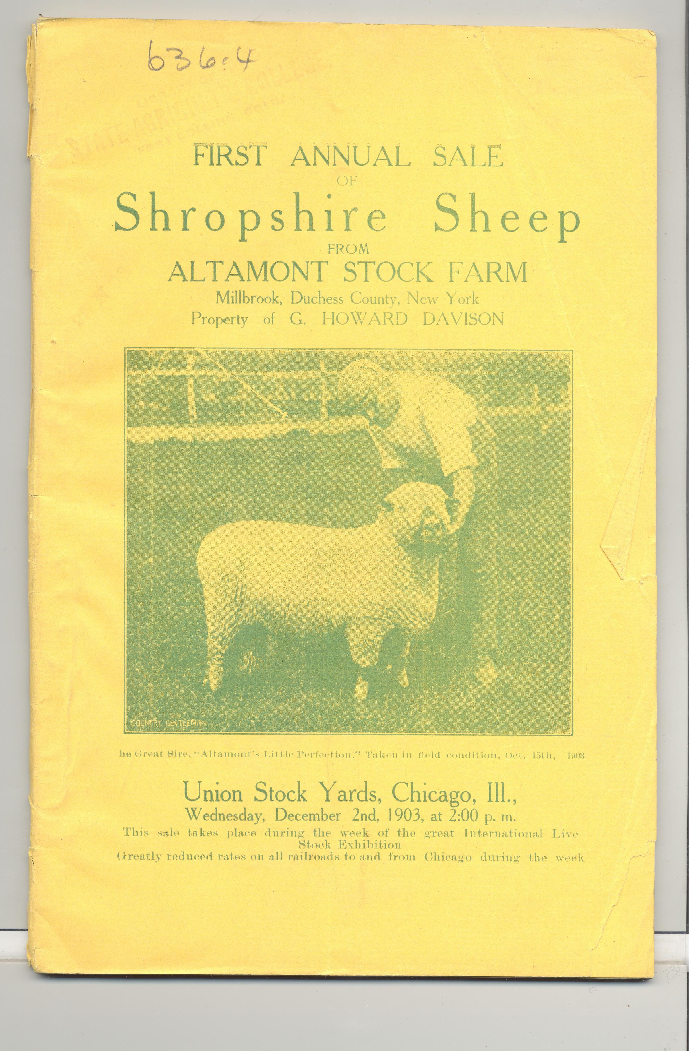 CAT, LIVESTOCK, 1903, IL. FIRST ANNUAL SALE OF SHROPSHIRE SHEEP FROM ALTAMONT STOCK FARM, MILLBROOK, DUTCHESS COUNTY, NY. HELD AT UNION STOCK YARDS, CHICAGO. 61 PP. YELLOW PAPER W/GREEN PRINT, SOME PHOTOS. 6" X 9"Created By