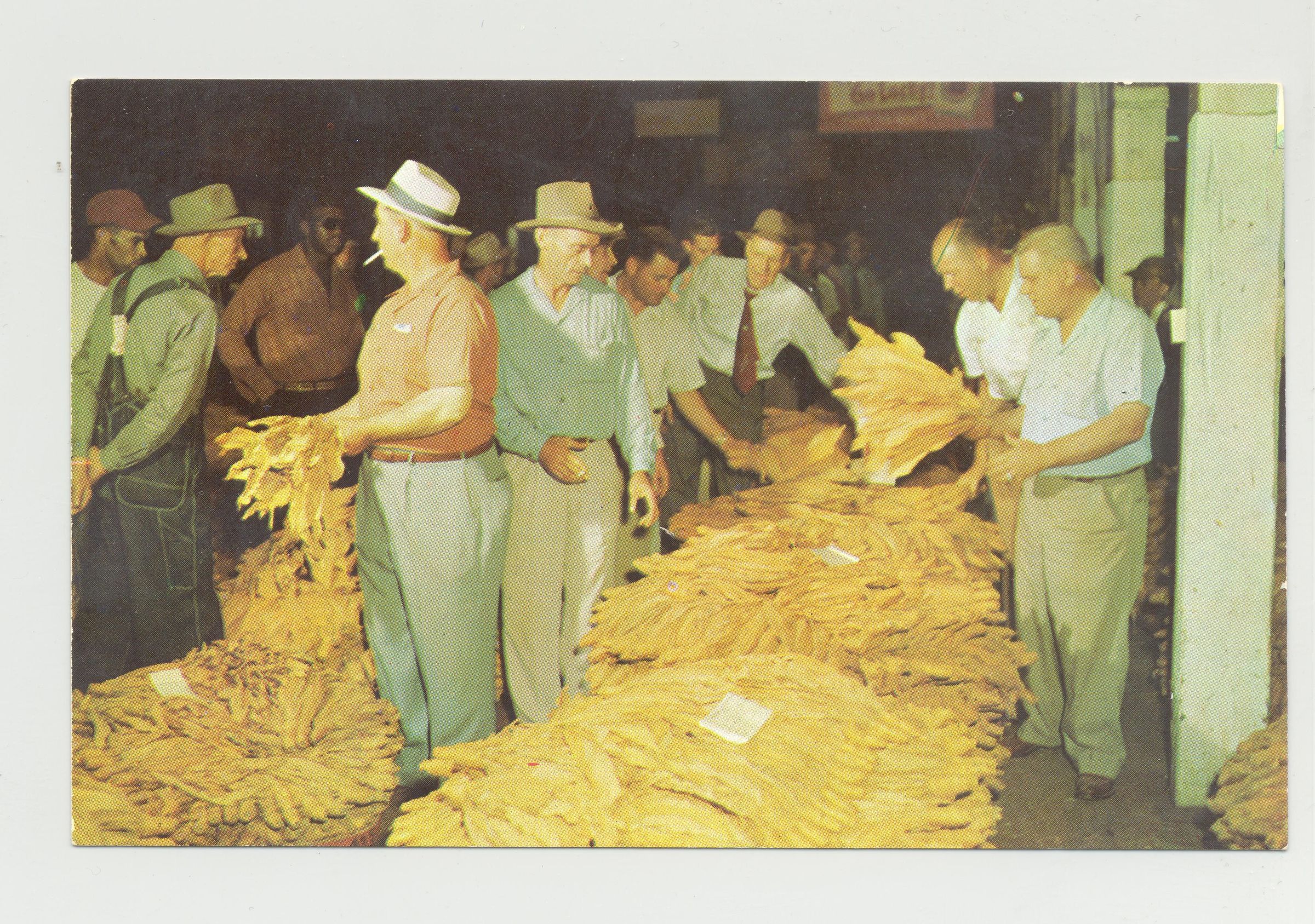PSTCD, TOBACCO. "A FAMILIAR SCENE IN TOBACCOLAND-EACH FARMER ARRANGES HIS TOBACCO ON INDIVIDUAL BASKETS ACCORDING TO GRADE. COLOR PRINTCreated By