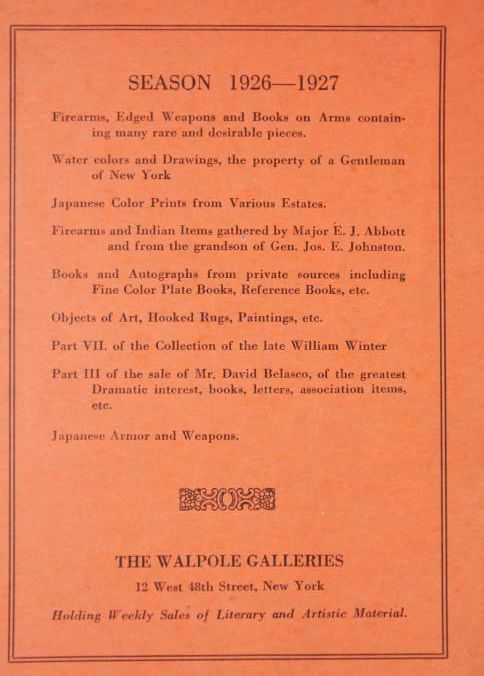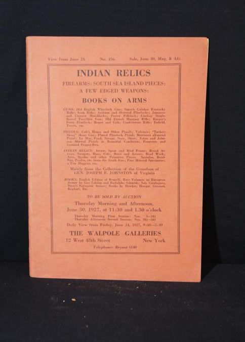 CAT, WEAPONS, 1927, NY. THE WALPOLE GALLERIES, INDIAN RELICS, FIREARMS, SOUTH SEA ISLAND PIECES, EDGED WEAPONS, BOOKS ON ARMS. B/W PHOTOS, 56 PP. 6" X 9"Created By