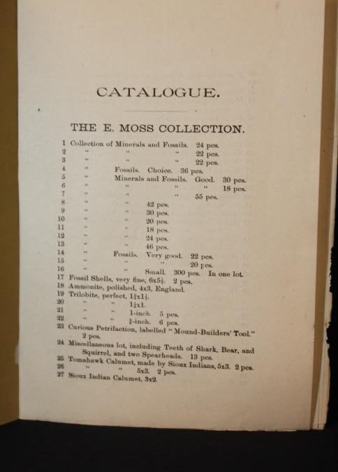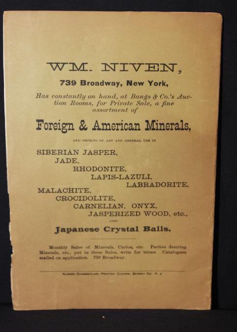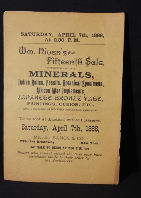 CAT, ARCHEOLOGICAL & ART, 1888, NY. WM. NIVEN'S 15TH SALE MINERALS, INDIAN RELICS, FOSSILS, BOTANICAL SPECIMENS, AFRICAN WAR IMPLEMENTS, PAINTINGS, CURIOS, ETC. BANGS & CO, AUCTIONEERS. 16 PP. 6" X 9"Created By