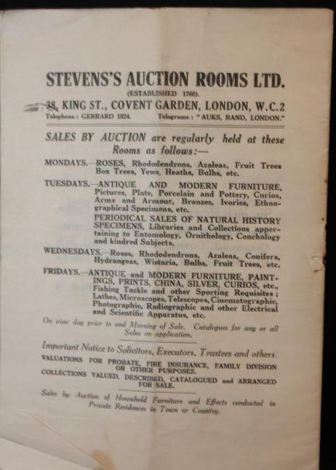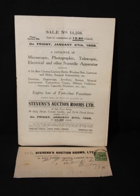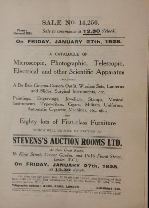 CAT, ANTIQUES, 1928, LONDON, ENGLAND. SCIENTIFIC INSTRUMENTS, FURNITURE, COLLECTIBLES. STEVENS'S AUCTION ROOMS LTD. 18 PP. 5 1/2" X 8 1/2"Created By