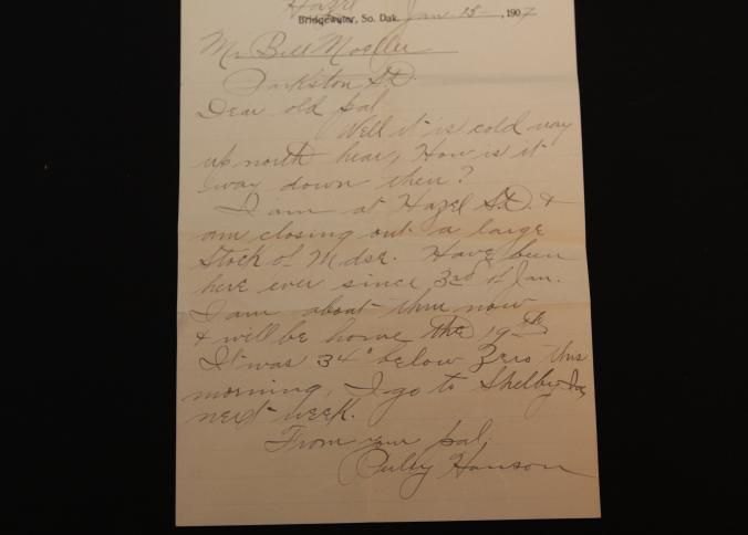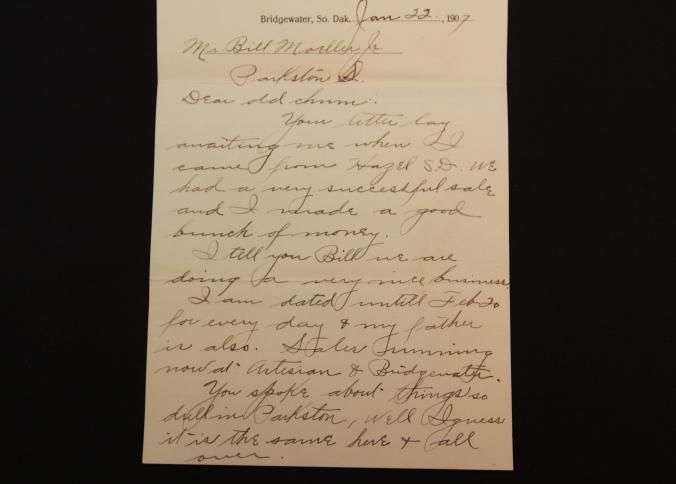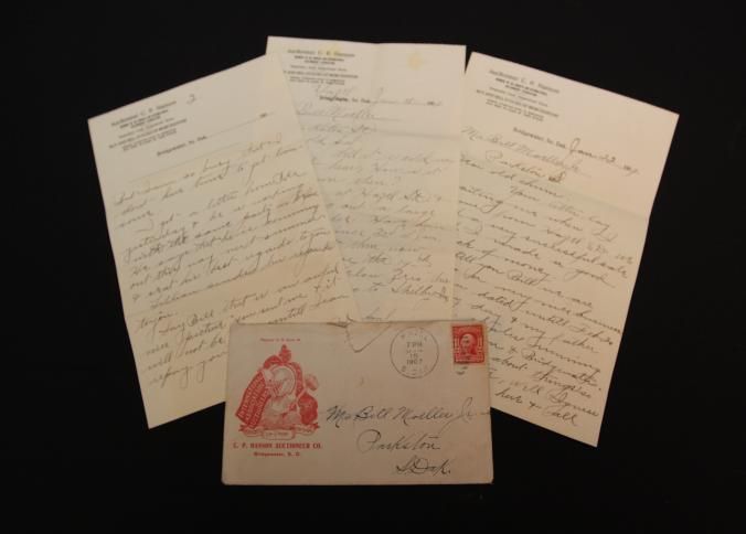 DOC, 1907, SD. PERSONAL LETTERS AND ENVELOPE W/LETTERHEAD. C.P. HANSON, AUCTIONEER.