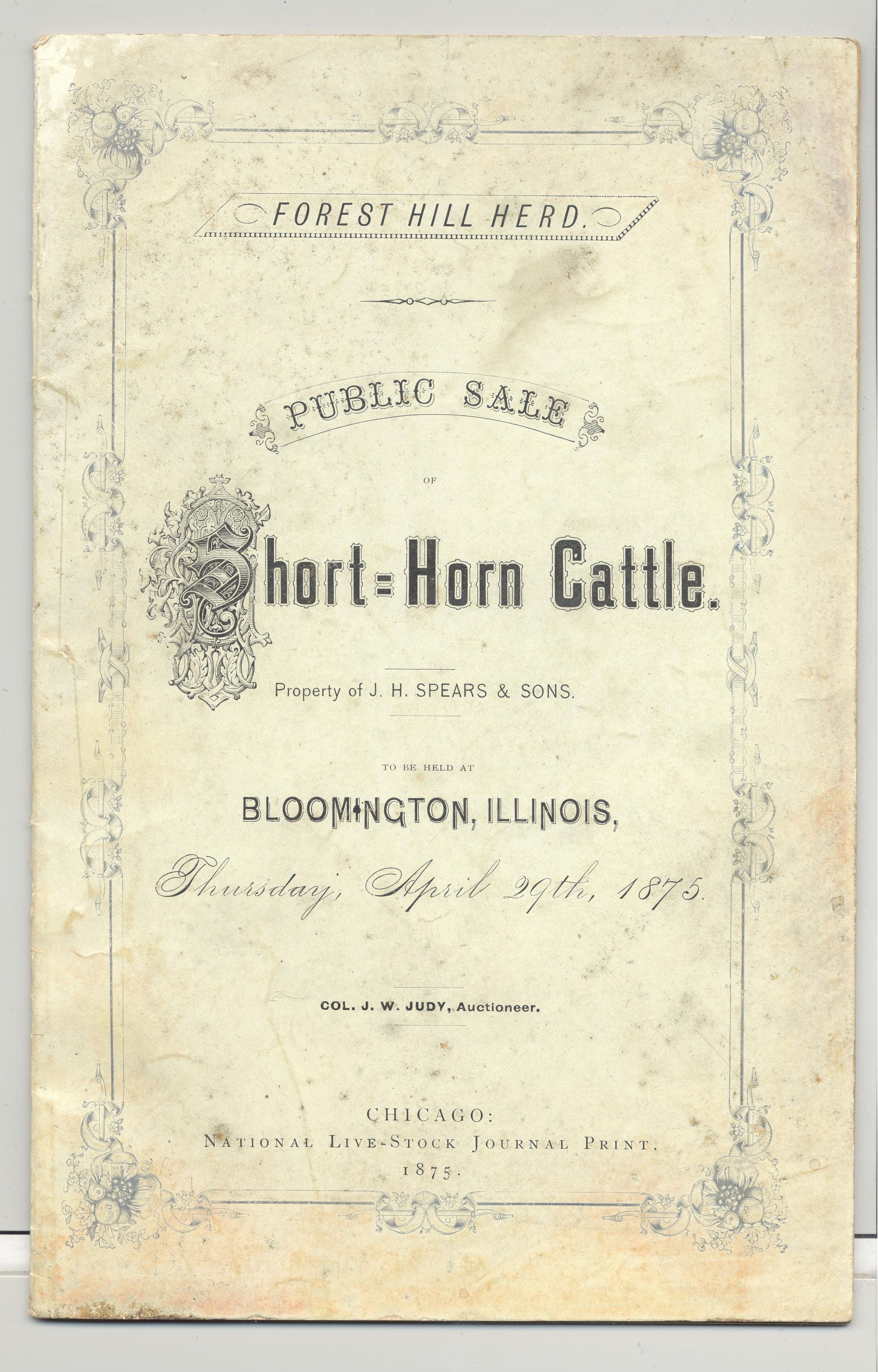 CAT, CATTLE, 1875, IL. FOREST HILL HERD PUBLIC SALE SHORT-HORN CATTLE. COL. J.W. JUDY, AUCTIONEER. 27 PP. 6" X 9"Created By