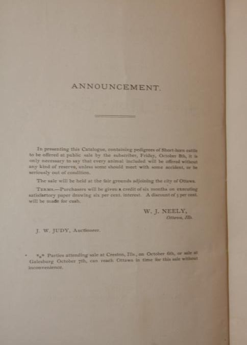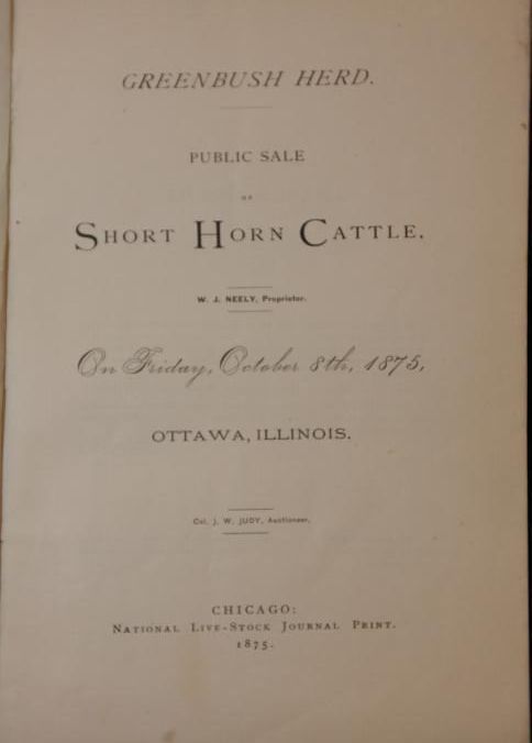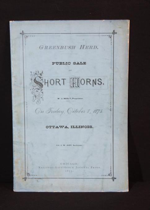 CAT, CATTLE, 1875, IL. GREENBUSH HERD, PUBLIC SALE OF SHORT HORNS. COL. J.W. JUDY, AUCTIONEER. 19 PP. 6" X 9"Created By