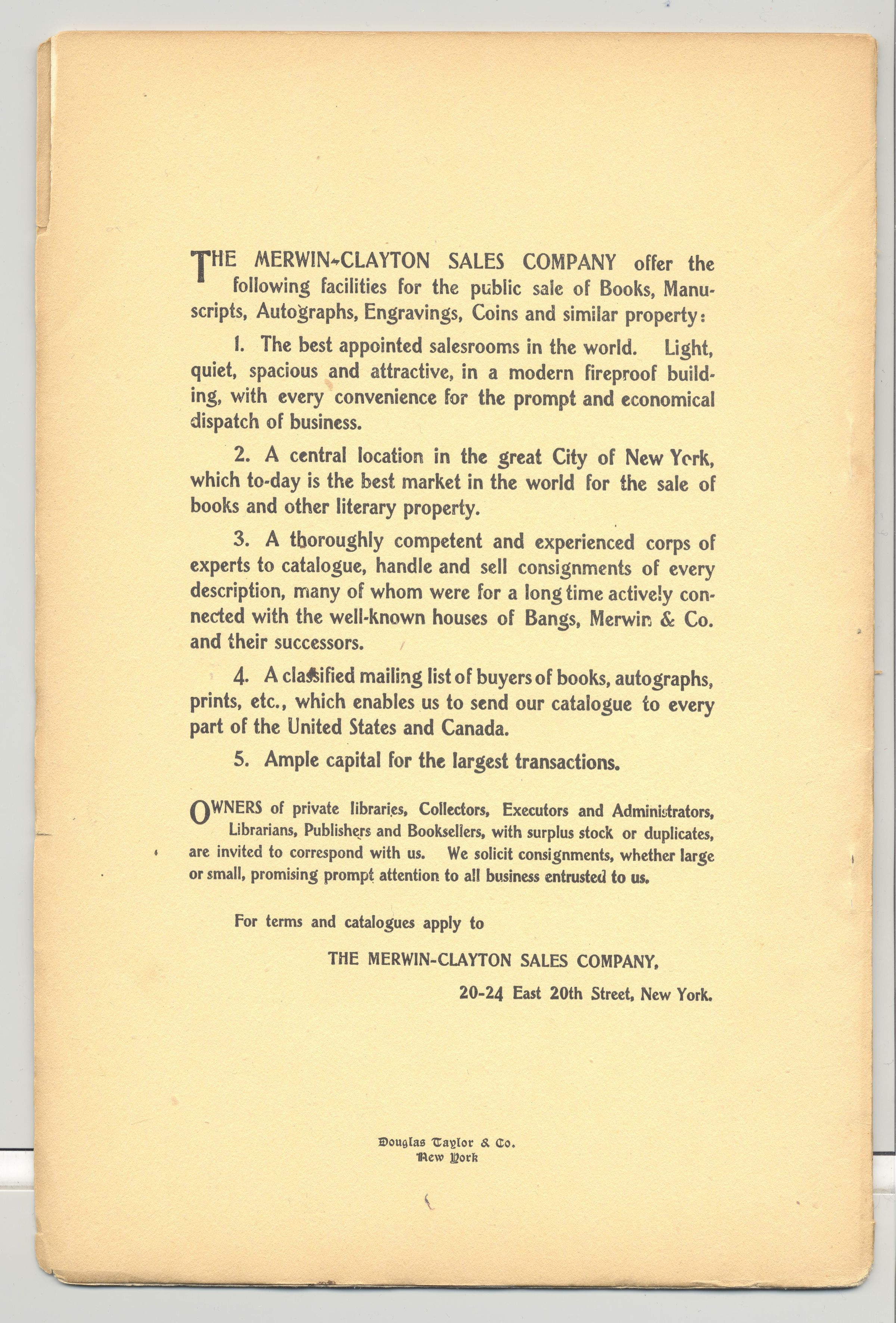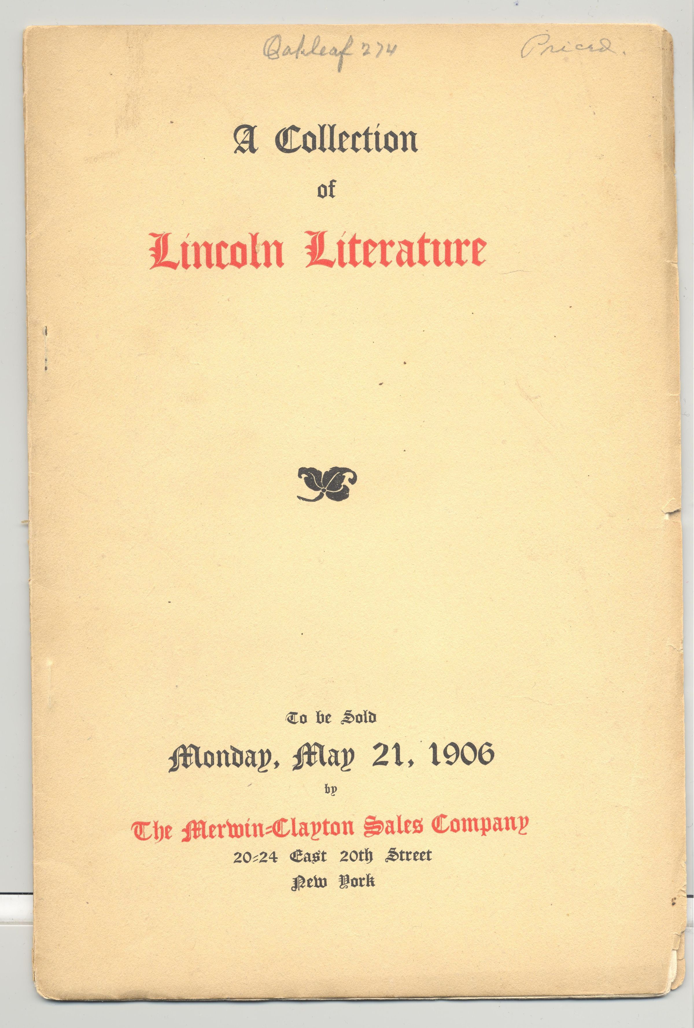 CAT, HISTORICAL LITERATURE, 1906, NY. A COLLECTION OF LINCOLN LITERATURE, MERWIN-CLAYTON SALES CO. PRICED. 25 PP. 6 1/2" X 9 1/2"Created By