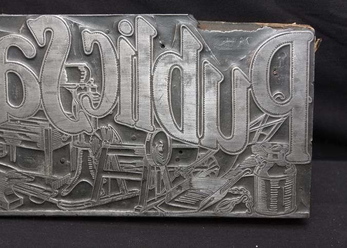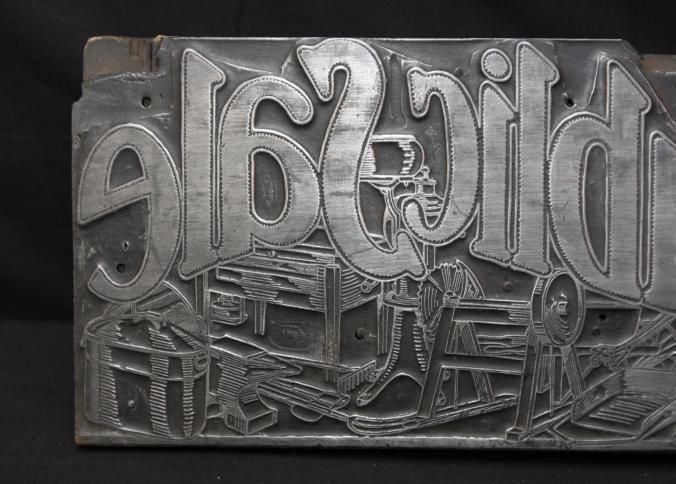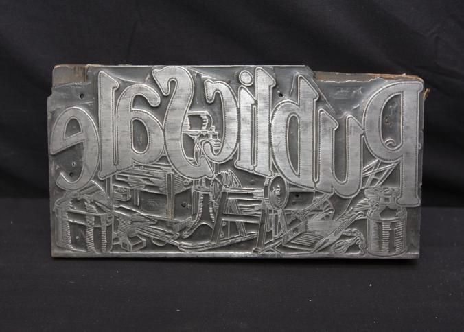 PRINTING BLOCK, WOOD AND METAL. "PUBLIC SALE" 9" X 5 1/2" X 1"