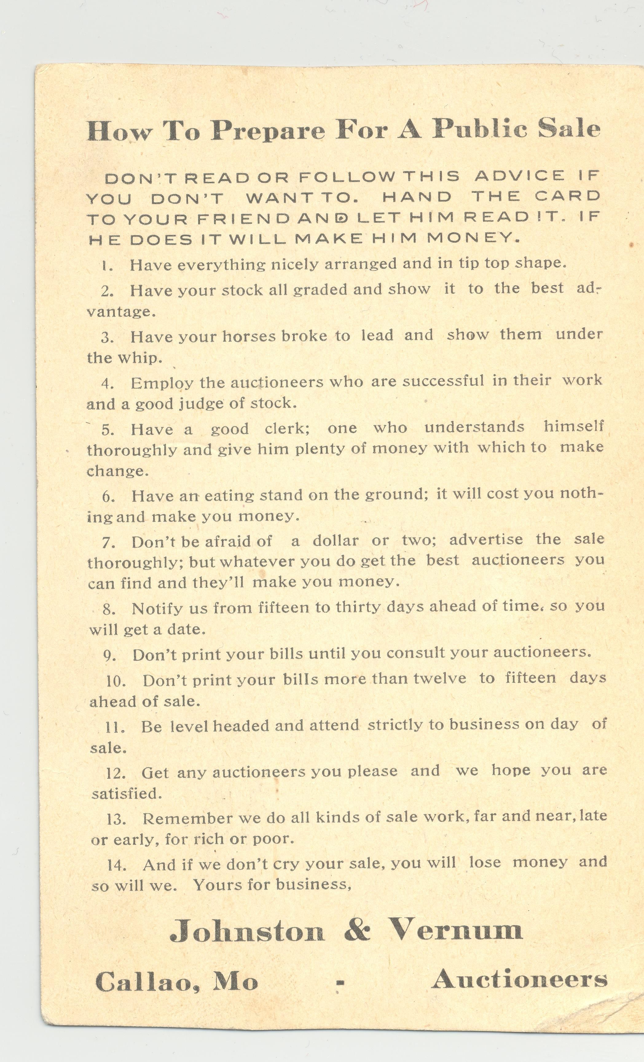 TRCD, MO. JOHNSTON & VERNUM, AUCTIONEERS "THE MEN WHO GET YOU THE MONEY". ON BACK "HOW TO PREPARE FOR A PUBLIC SALE" 5 1/4" X 4 1/2" B/W PHOTO AUCTIONEERS.Created By