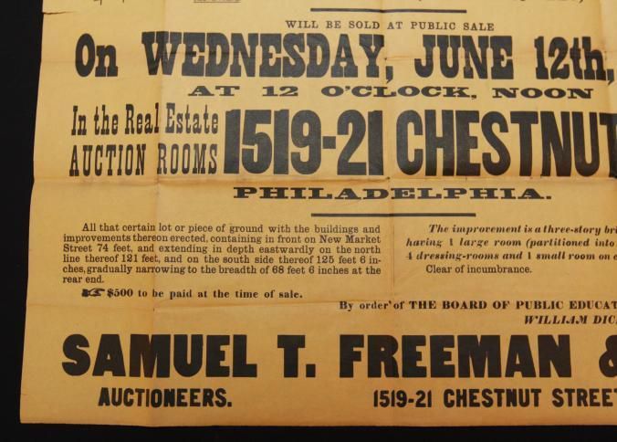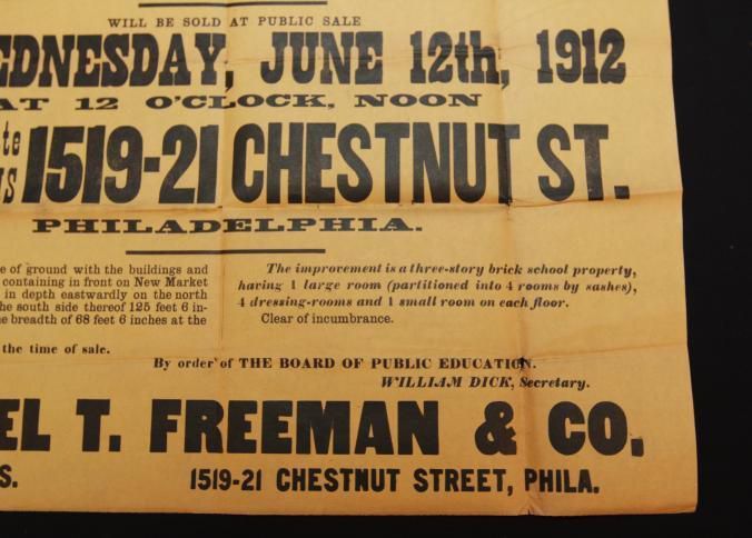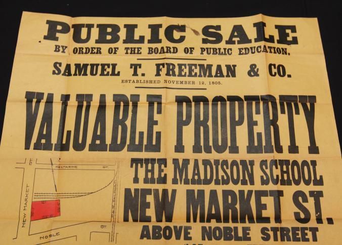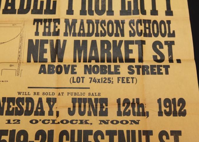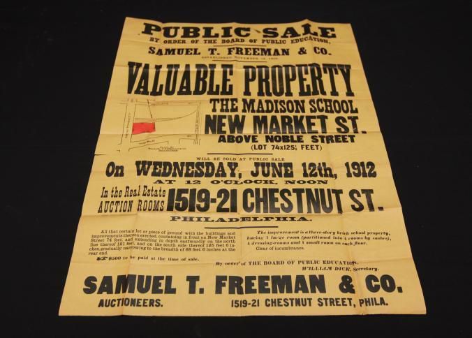 BROADSIDE, 1912, REAL ESTATE, PA. SAMUEL FREEMAN & CO, AUCTIONEERS. VALUABLE PROPERTY THE MADISON SCHOOL, NEW MARKET ST. 24" X 20"Created By