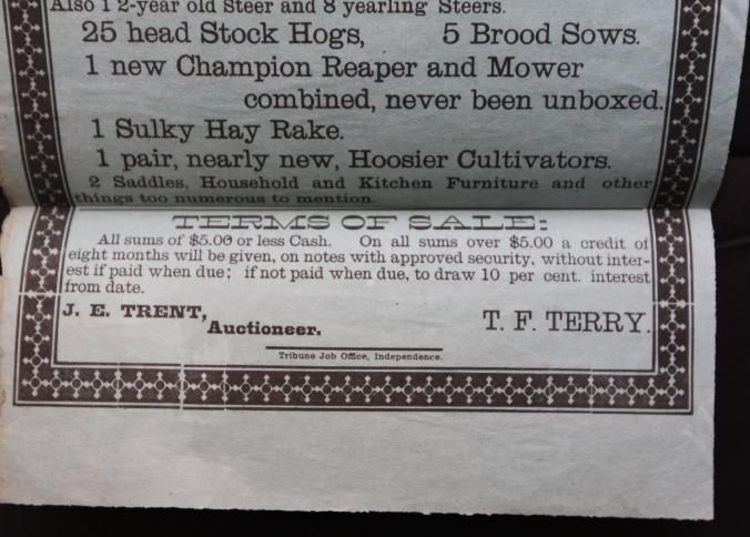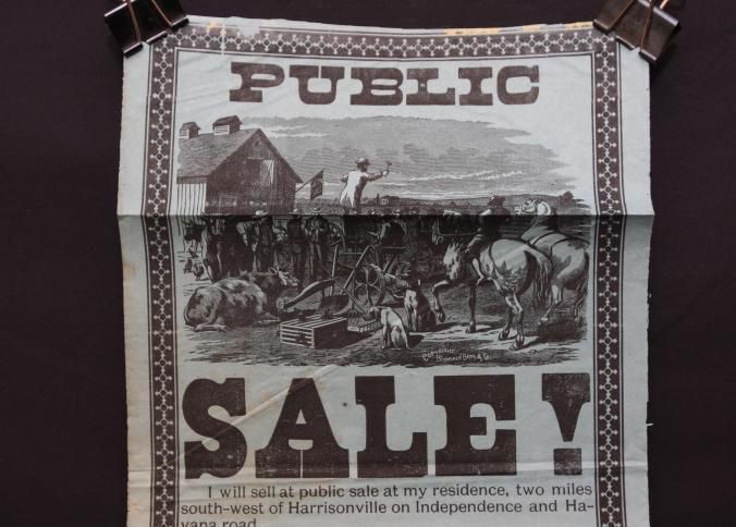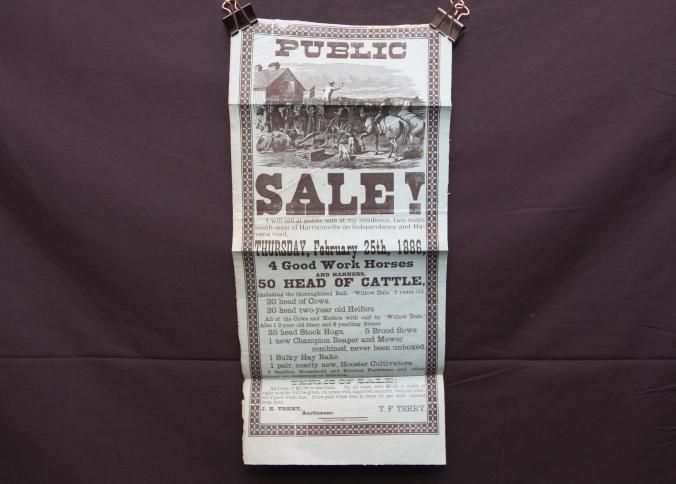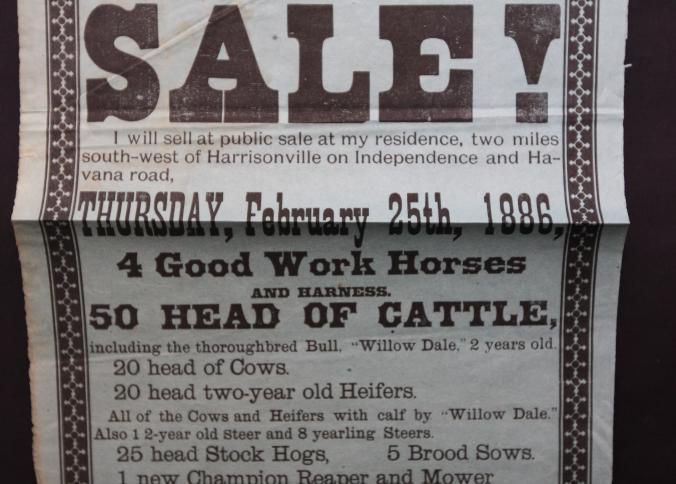BROADSIDE, FARM, 1886, HARRISONVILLE. LIVESTOCK, EQUIPMENT, HOUSEHOLD. J.E. TRENT, AUCTIONEER. 9" X 18 1/2"Created By