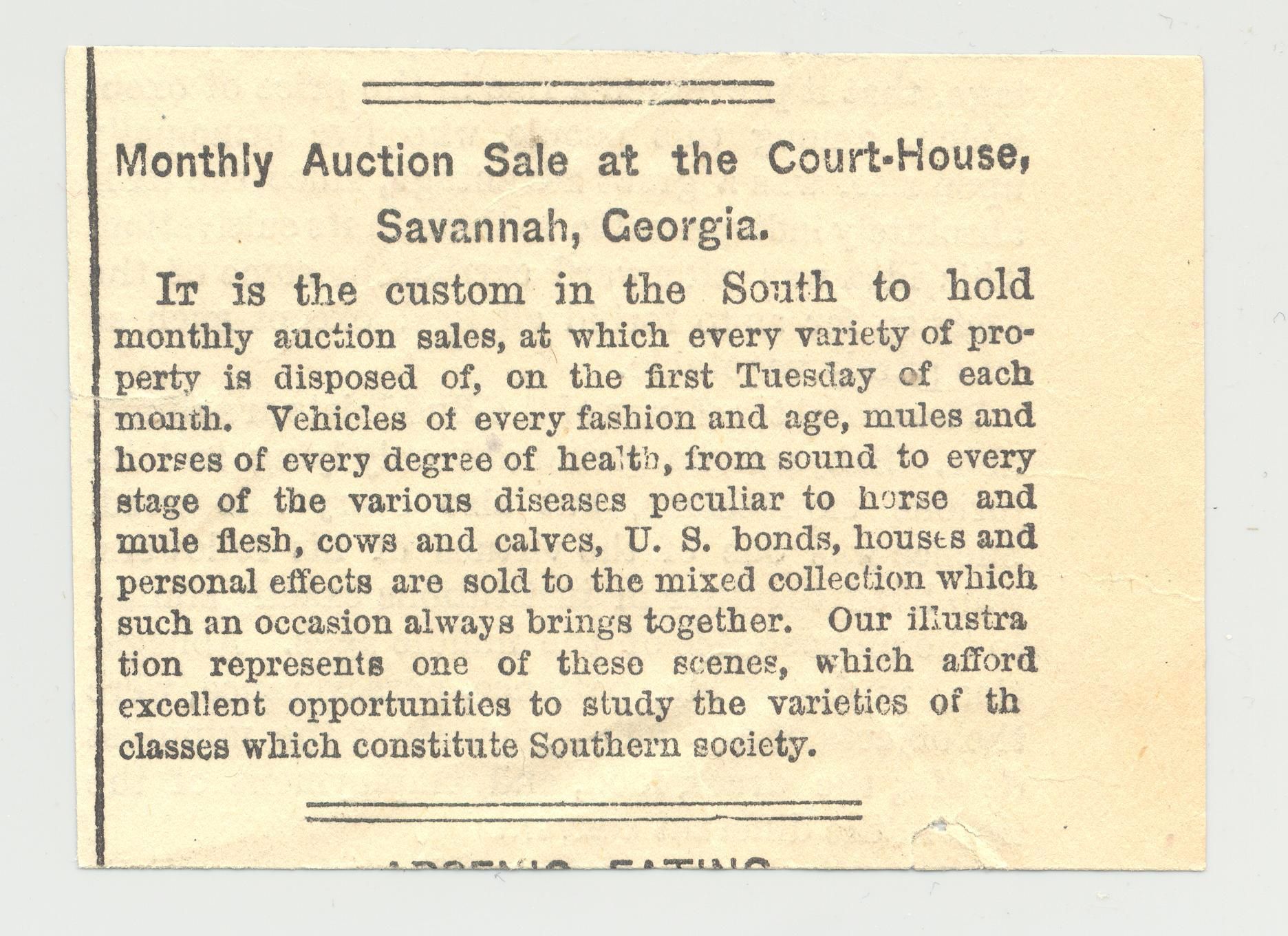 NEWSCLIPPING, "MONTHLY AUCTION SALE AT COURT-HOUSE, SAVANNAH, GA. 2 3/4" X 2"