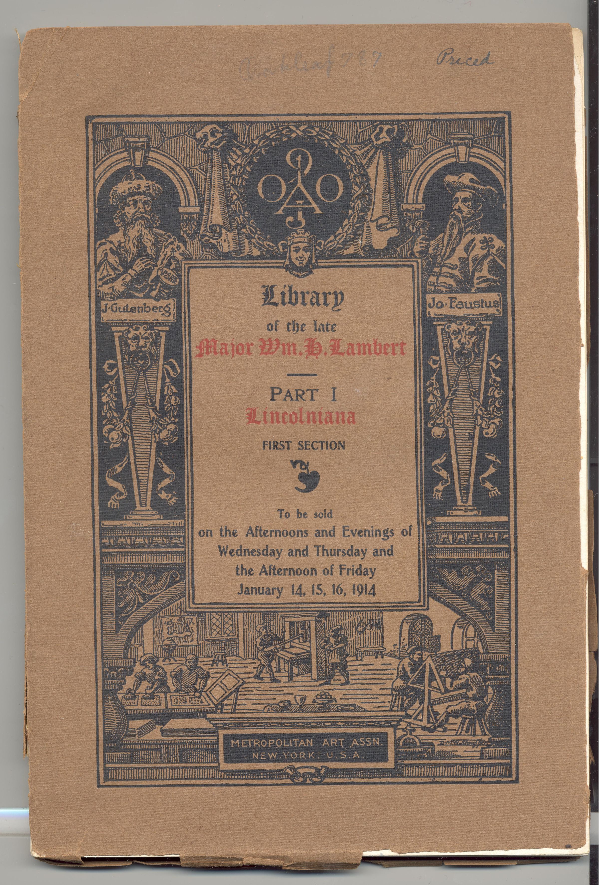 CAT, BOOKS, 1914, NY. LIBRARY OF THE LATE MAJOR WM LAMBERT, PART 1 LINCOLNIANA FIRST SECTION. PRICED. 123 PP. 6" X 9"Created By