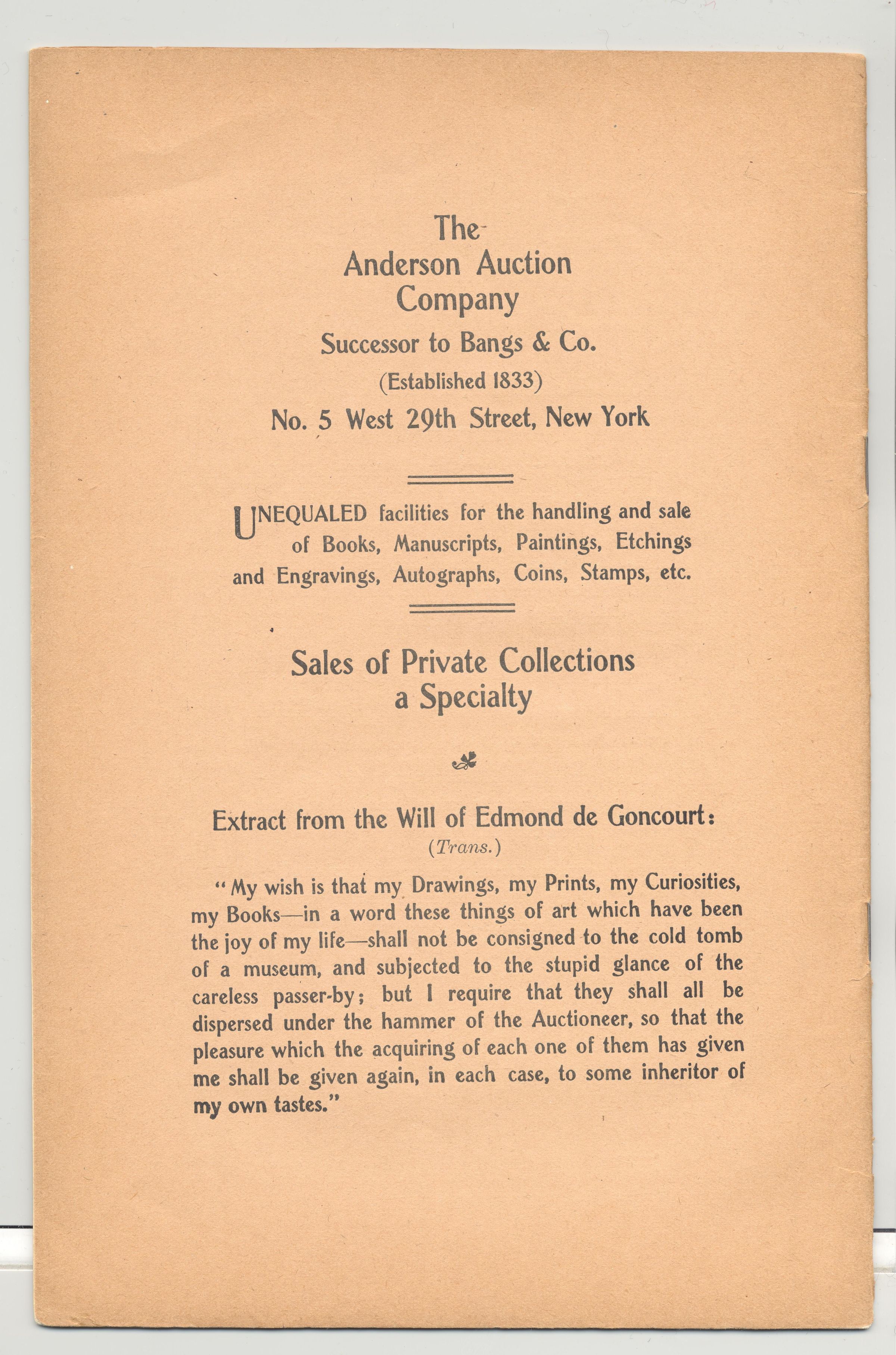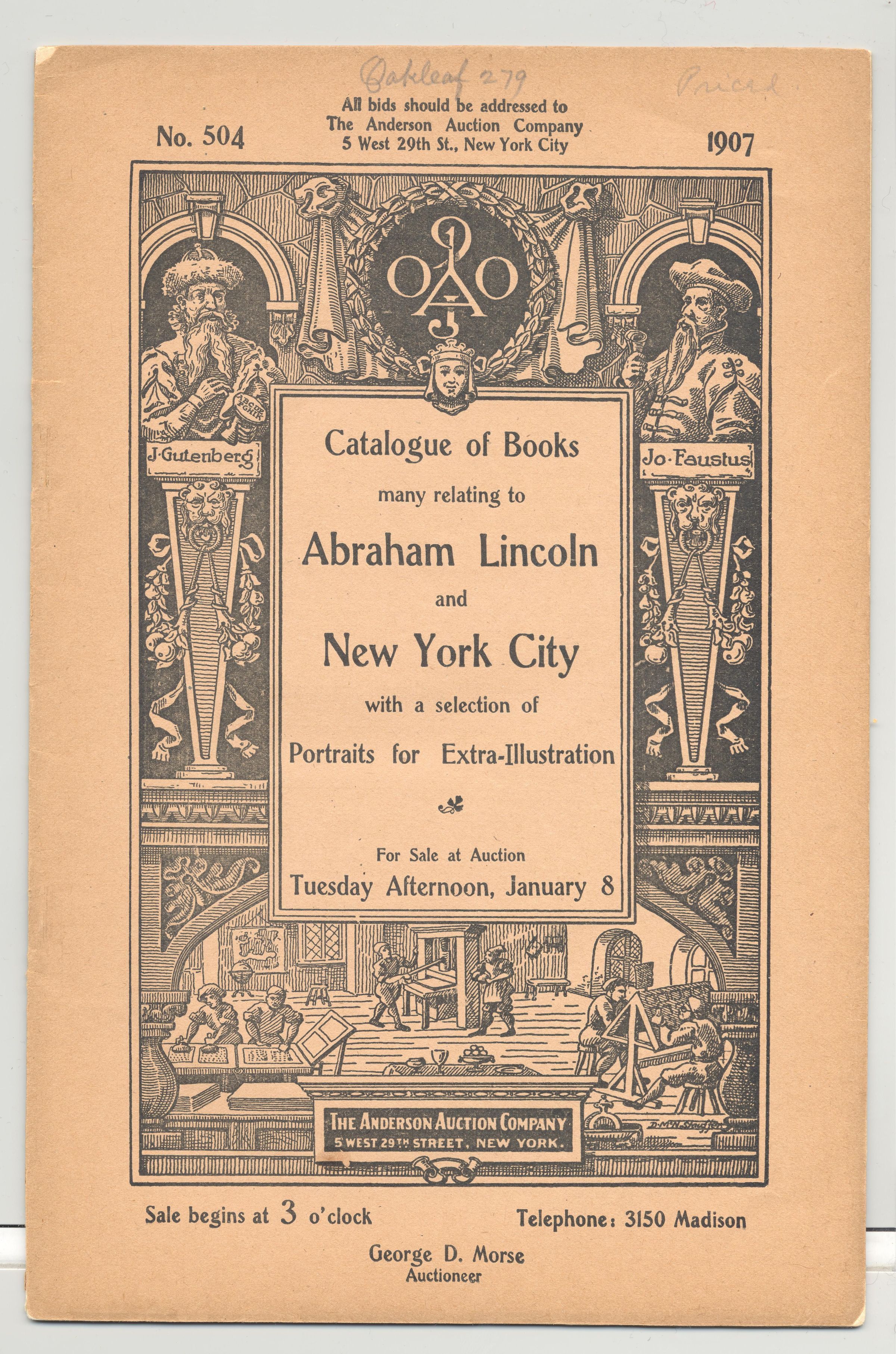 CAT, BOOKS, 1907, NY. RELATING TO ABRAHAM LINCOLN AND NYC, GEORGE MORSE, AUCTIONEER. PRICED, 19 PP. 6" X 9"Created By