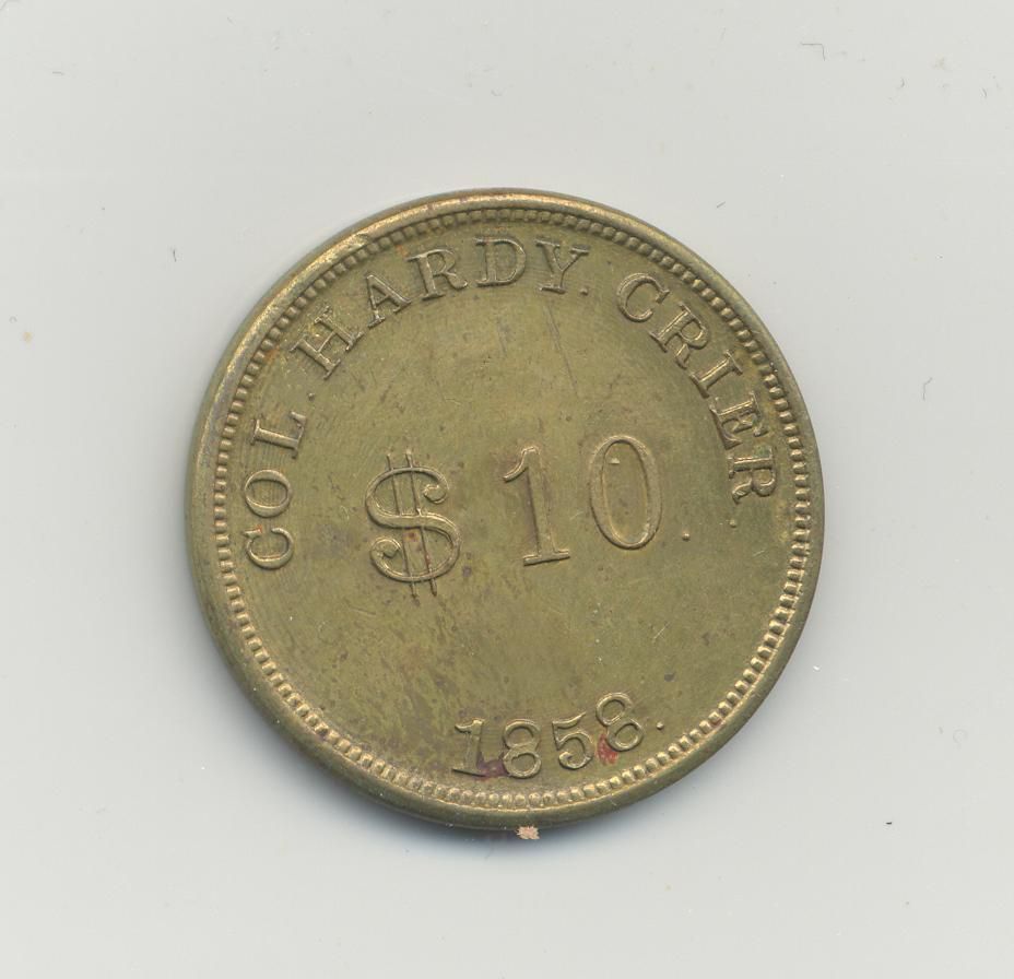 COIN, ADVERTISING, 1858. COL. HARDY CRIER, $10, BACK SIDE: ALBION 11, DUKE OF BEDFORD, $20/$7, 1" DIAMETERCreated By